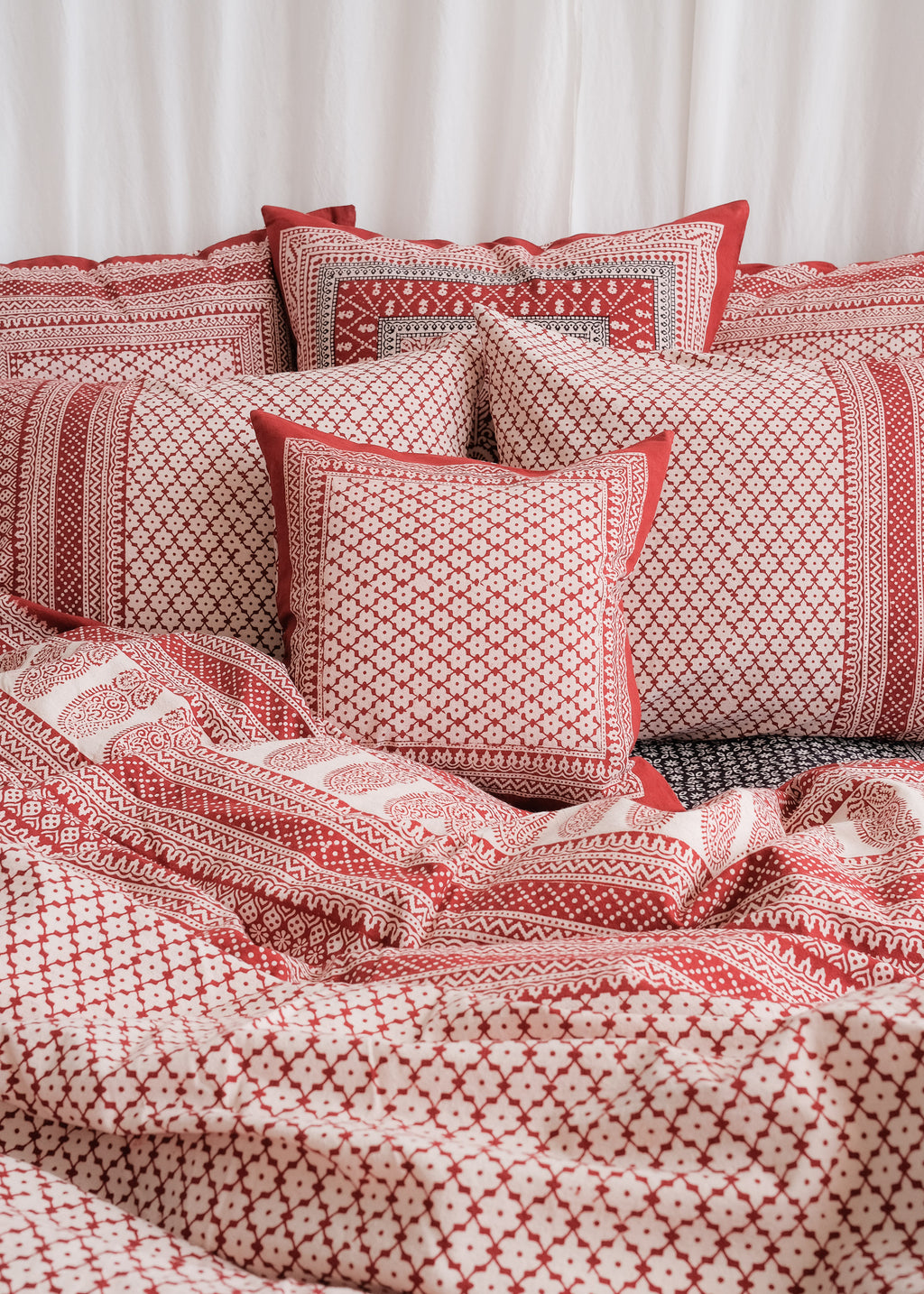 The impact of Bagh block prints comes from the dramatic use of red, black and white; a style which originates with the Bhil and Bhilala cultures of central India. Highly recognizable Bagh prints are a bold evolution of the block printer’s art.