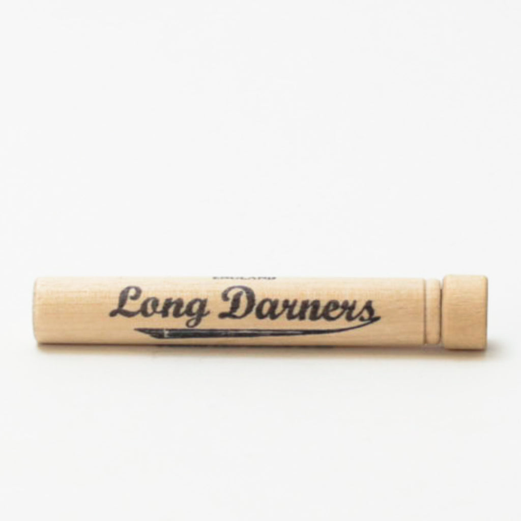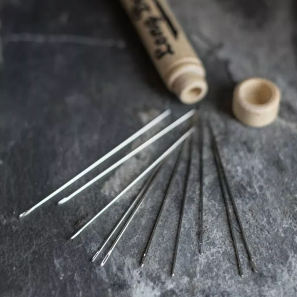 Long needles with long eyes suitable for thick thread or yarn. 10 needles. They are the perfect choice for darning your socks and also do a good job of more industrious mending projects. A mixture of sizes in a turned wooden case. Fits in any bag or pocket.