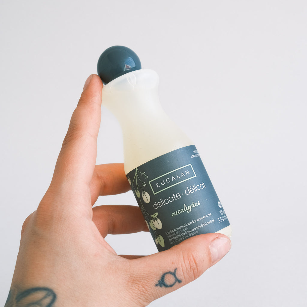 Eucalan is a No Rinse Delicate Wash that is non-toxic, biodegradable, and free of bleach, phosphates, synthetic fragrance and dye. Eucalan is pH neutral and is packaged in an easy to recycle, dye free hdpe plastic bottle. Eucalan is scented with essential oils of eucalyptus, lavender, and grapefruit, and is also available in natural (unscented). The lanolin acts as a natural conditioner, keeping fibres supple and reducing static.