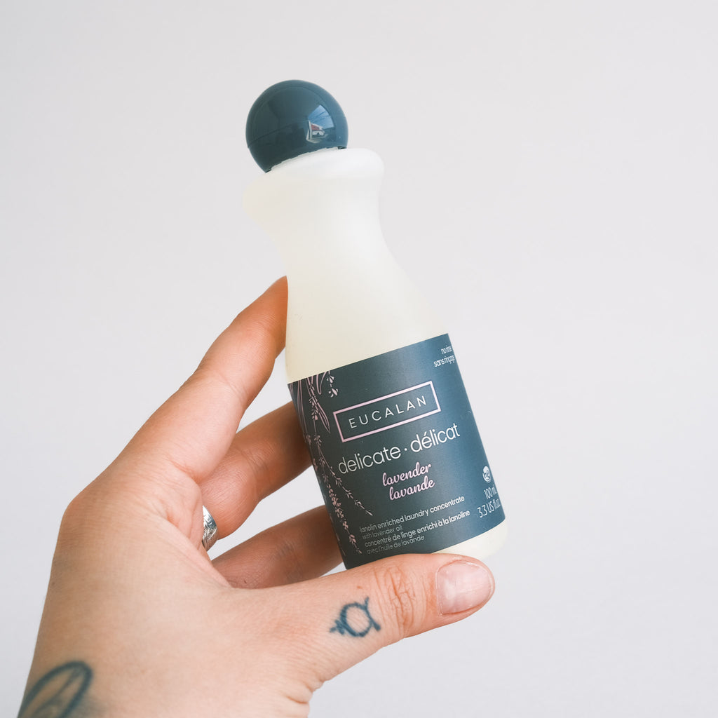 Eucalan is a No Rinse Delicate Wash that is non-toxic, biodegradable, and free of bleach, phosphates, synthetic fragrance and dye. Eucalan is pH neutral and is packaged in an easy to recycle, dye free hdpe plastic bottle. Eucalan is scented with essential oils of eucalyptus, lavender, and grapefruit, and is also available in natural (unscented). The lanolin acts as a natural conditioner, keeping fibres supple and reducing static.