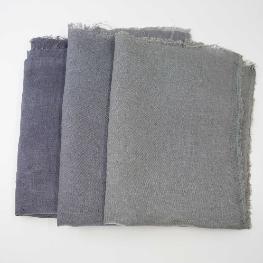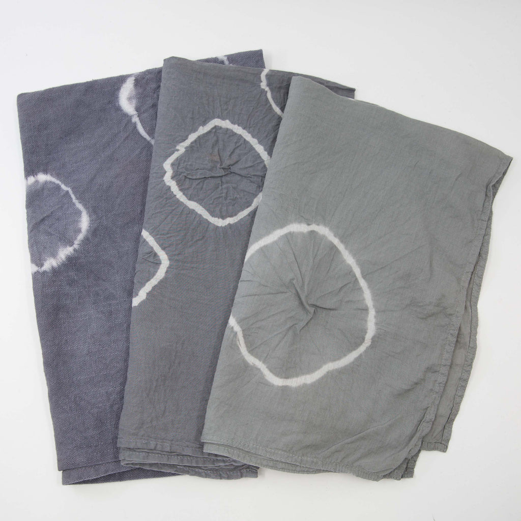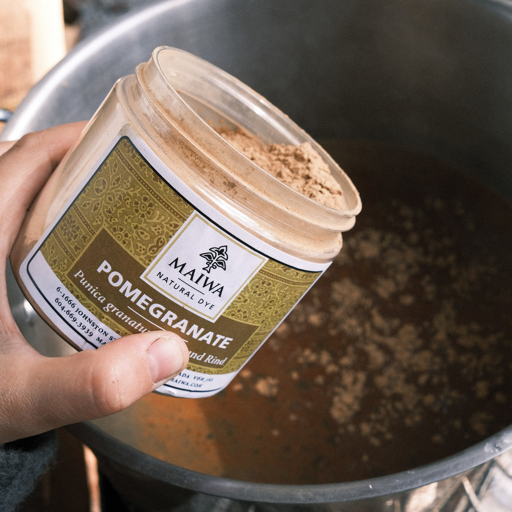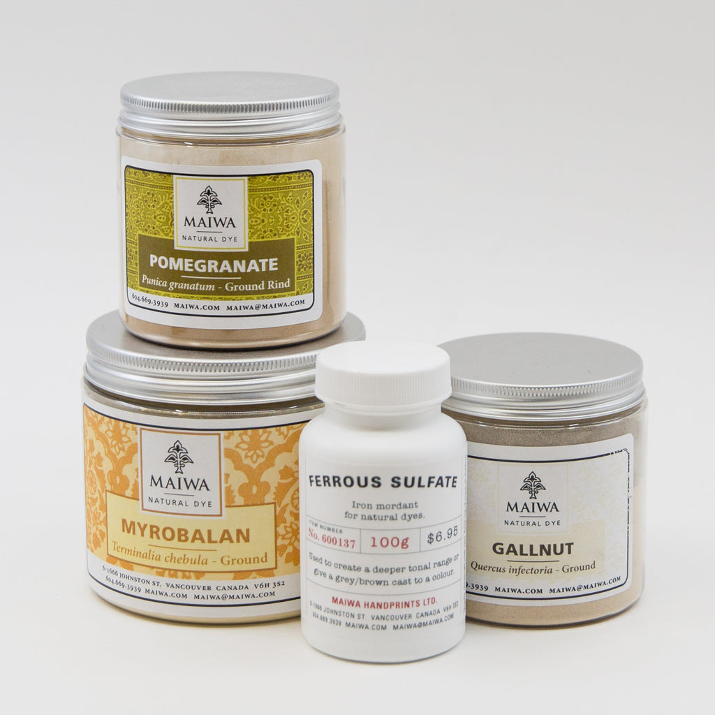 This Kit lets you dive into the world of grey. Myrobalan, pomegranate & gallnut are all rich in tannin that reacts with ferrous sulfate to create a variety of different greys. In the photo you can see (from left to right) that gallnut gives a purplish-grey, myrobalan gives a neutral stone-grey and pomegranate gives a greenish-grey. You can get different depths of grey by using anywhere between 0.5% WOF to 4% WOF ferrous sulfate.