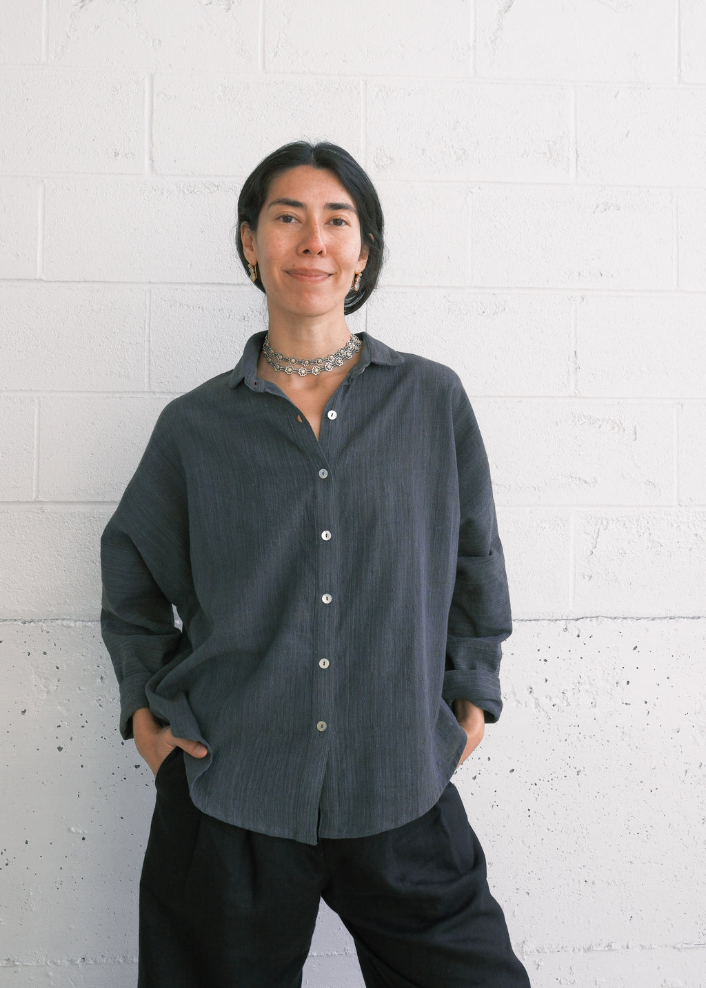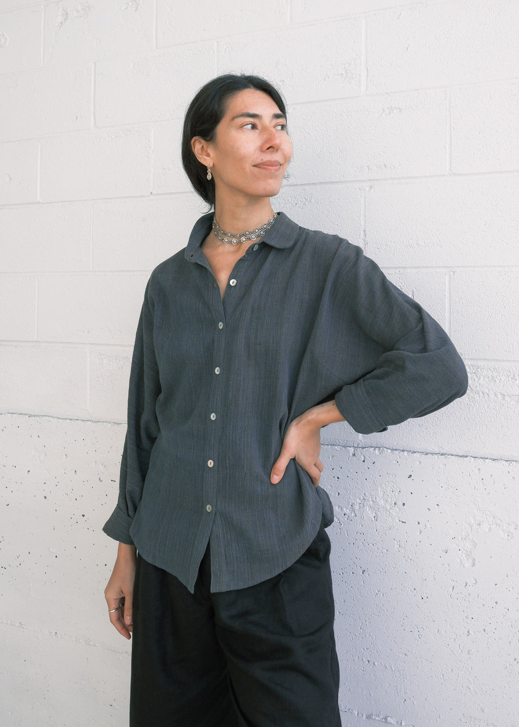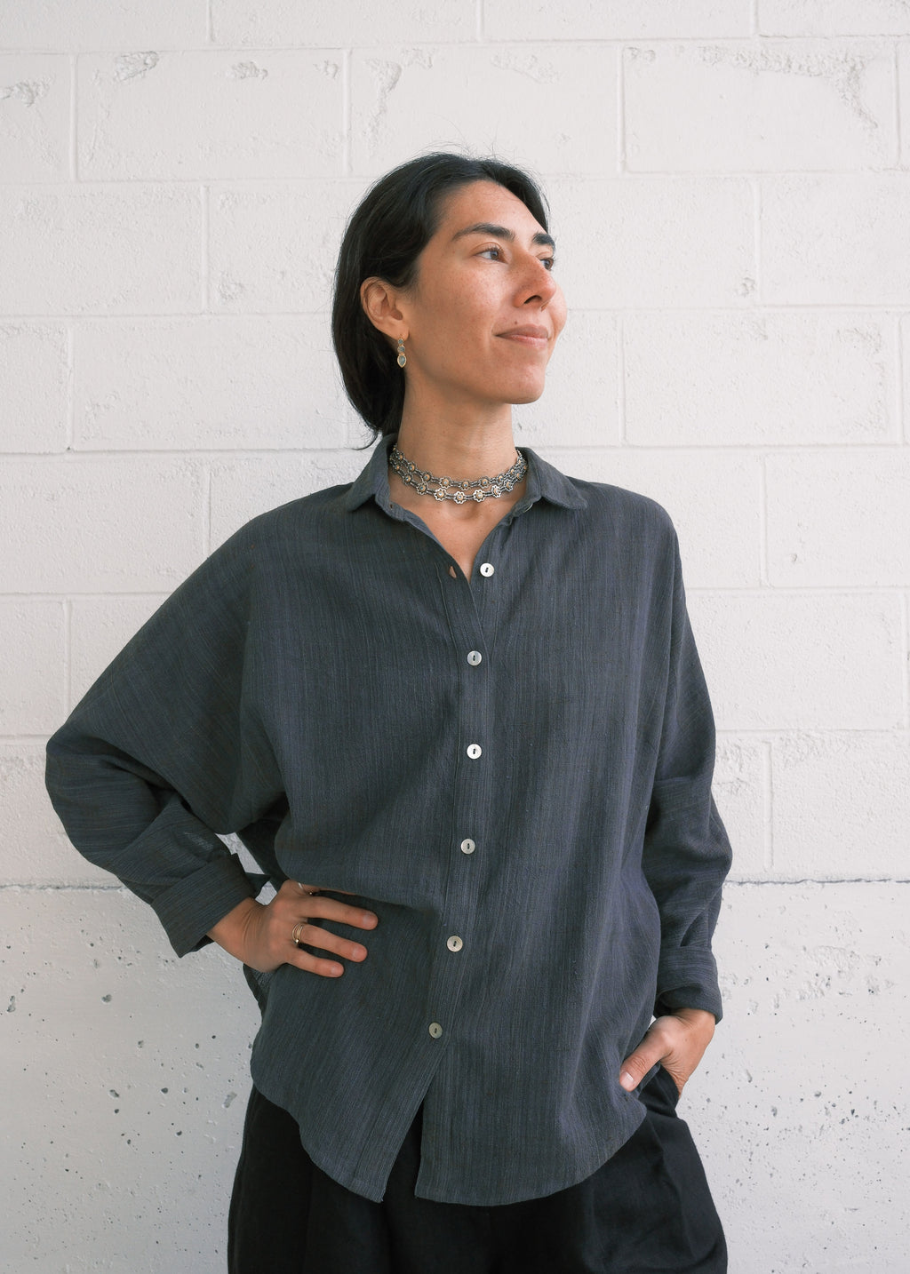 The Manali shirt is a classic button up with a shorter profile. We love this style for all its thoughtful details - accentuated buttoned cuff, traditional hem triangle at the sides, bust darts, and rounded collar. An easy to wear piece with a soft fit that you will reach for again and again.