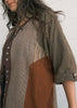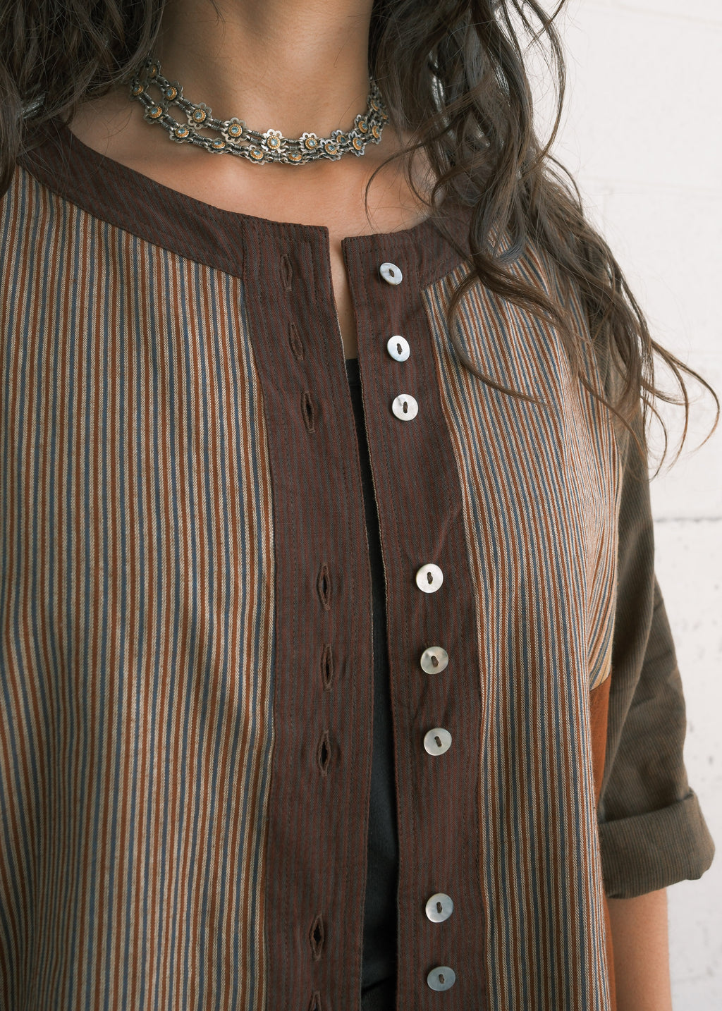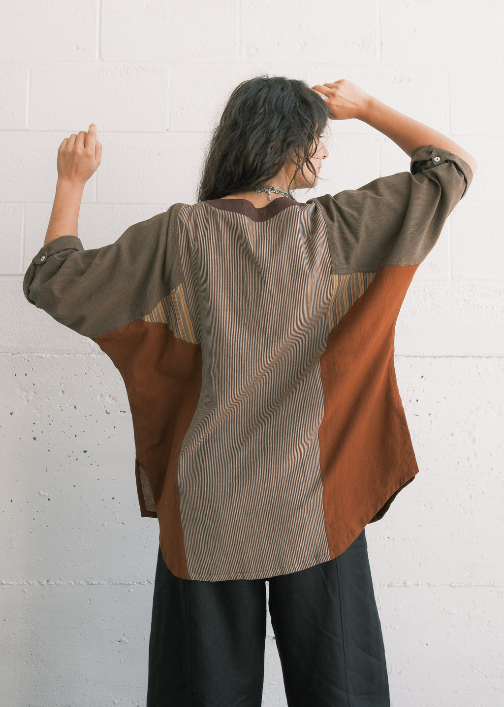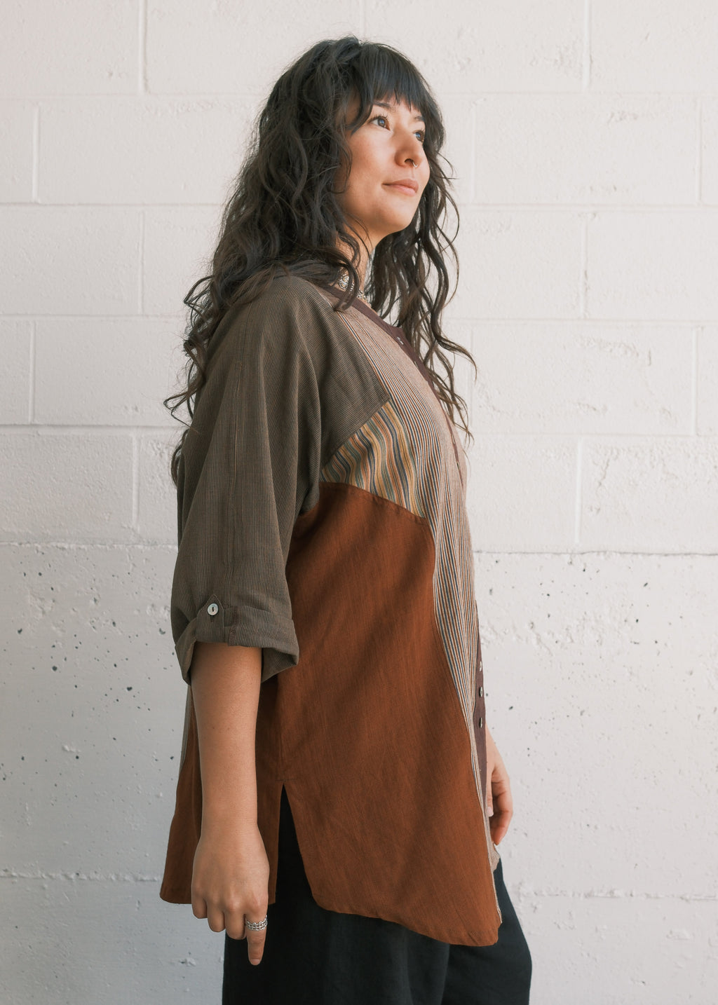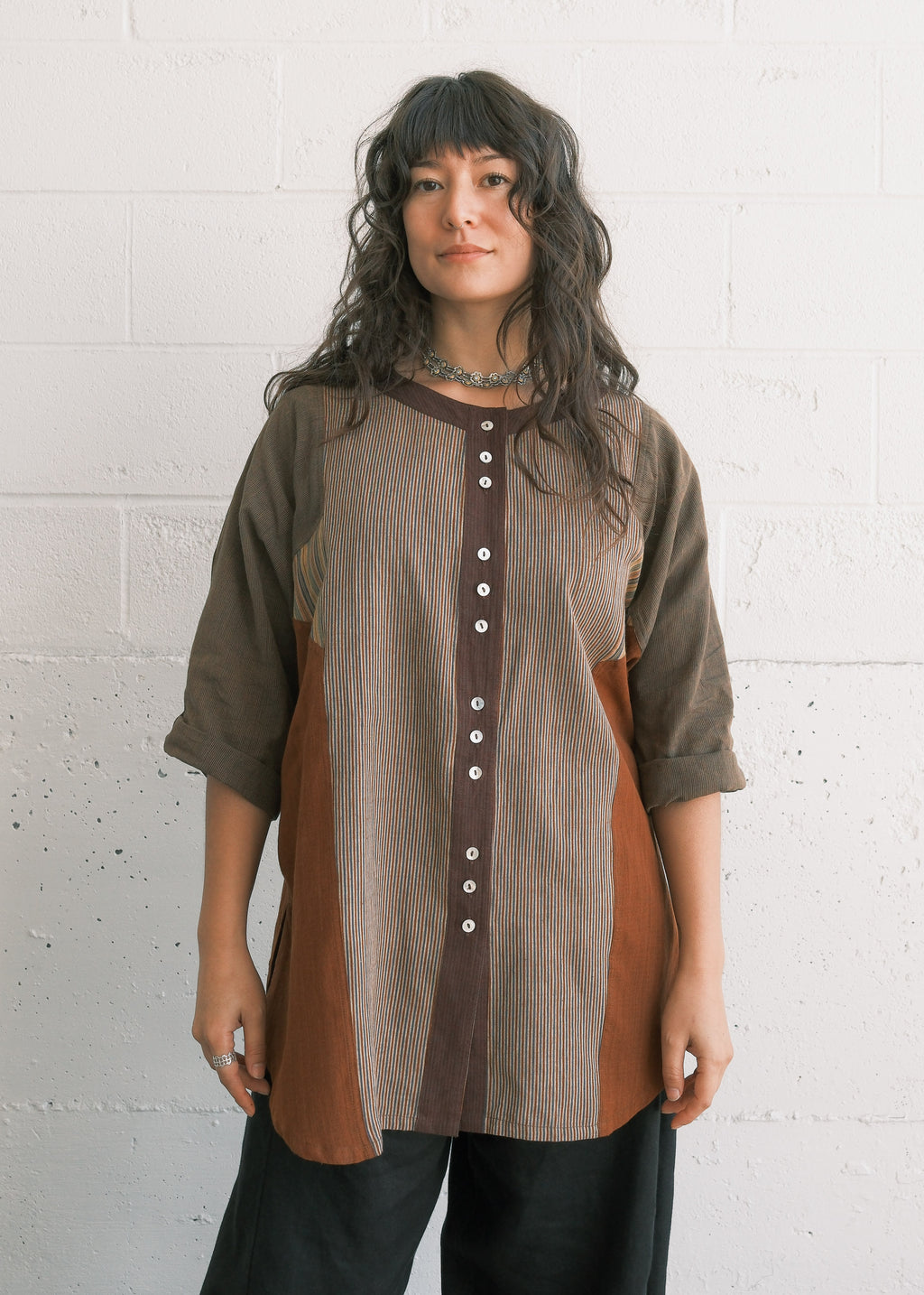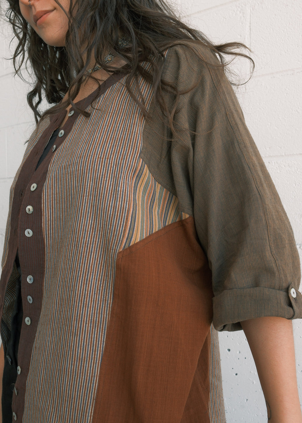 This handwoven cotton shirt presents a mosaic structure, where multiple fabric panels are strategically combined to create a cohesive design. Each piece is unique - there may be the slightest variation between pieces. The overall feeling with be similar to the shirt photographed.