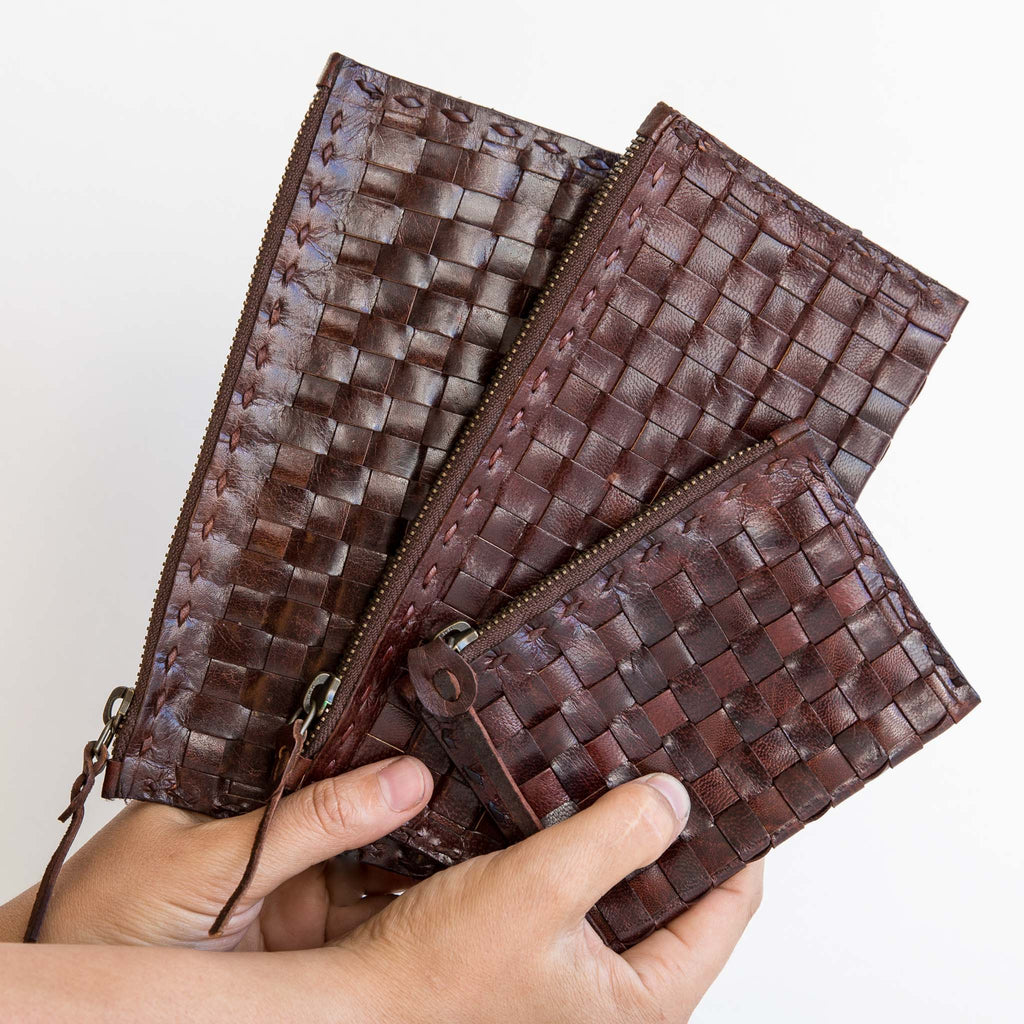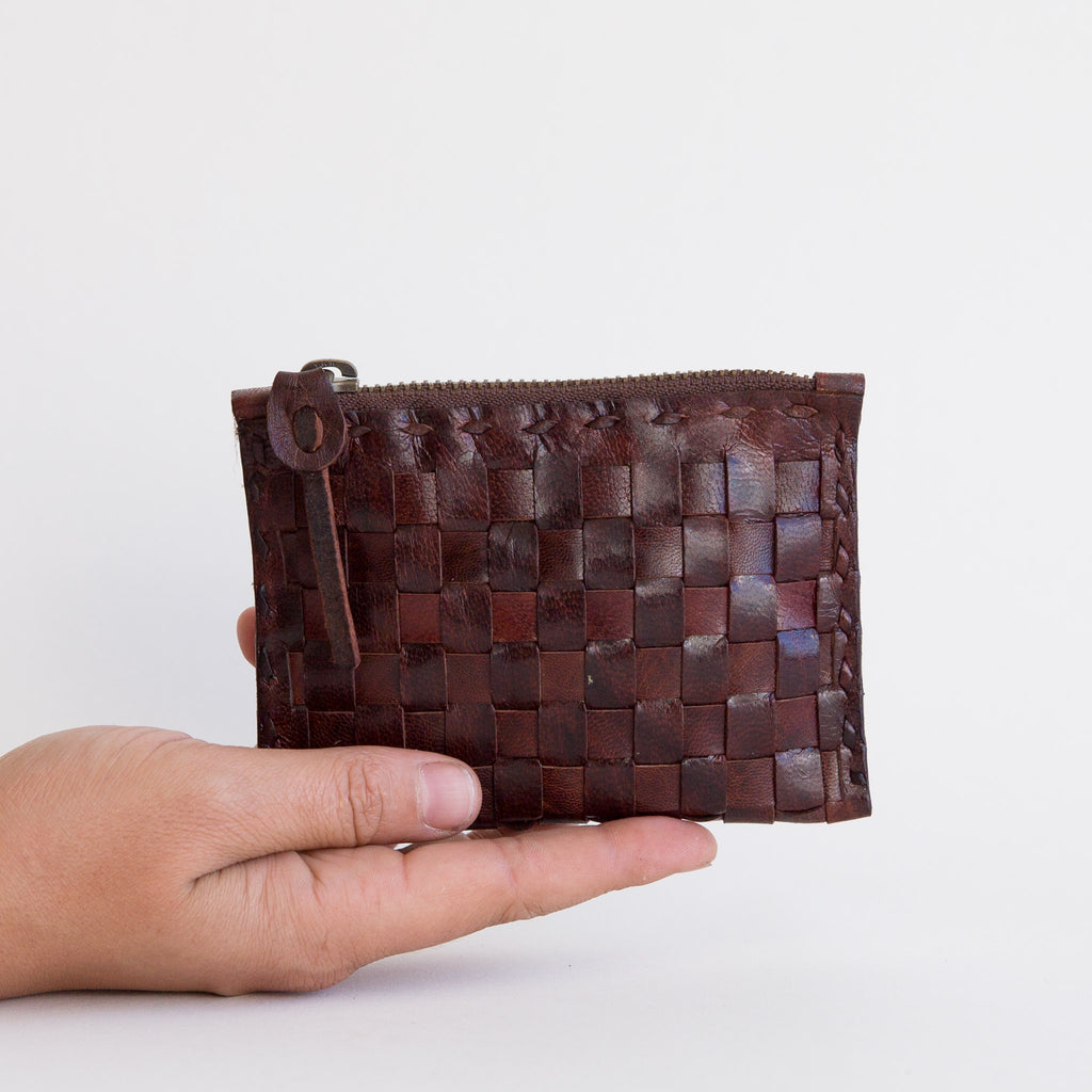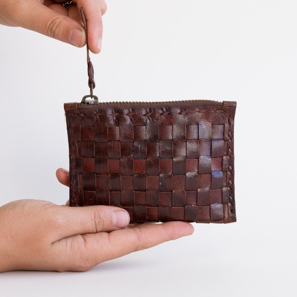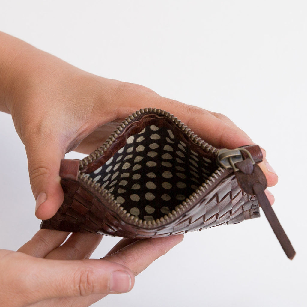 Woven leather in our smallest size. This pouch works well as a coin purse or as a card holder. It is also a perfect solution to carry your earbuds, or charger cable. Zippered enclosure with a leather pull.