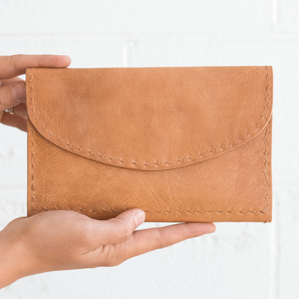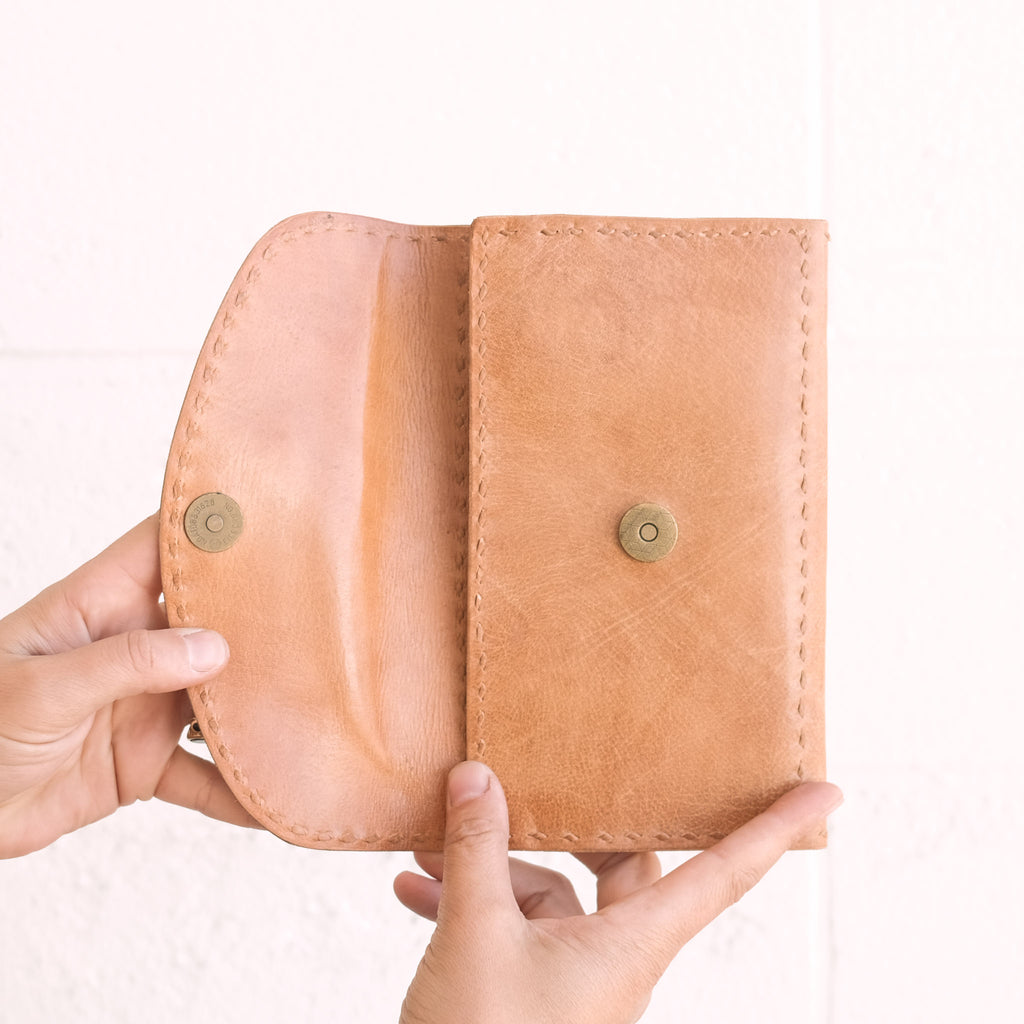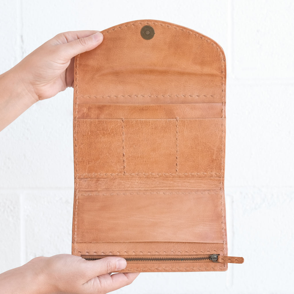 A classic design that looks great while keeping all your essentials organized. Inside the brass snap button, you’ll find 3 secured card slots, a zippered pocket, and 2 pockets that run the length of the wallet.  Featuring beautiful handstitched leather.