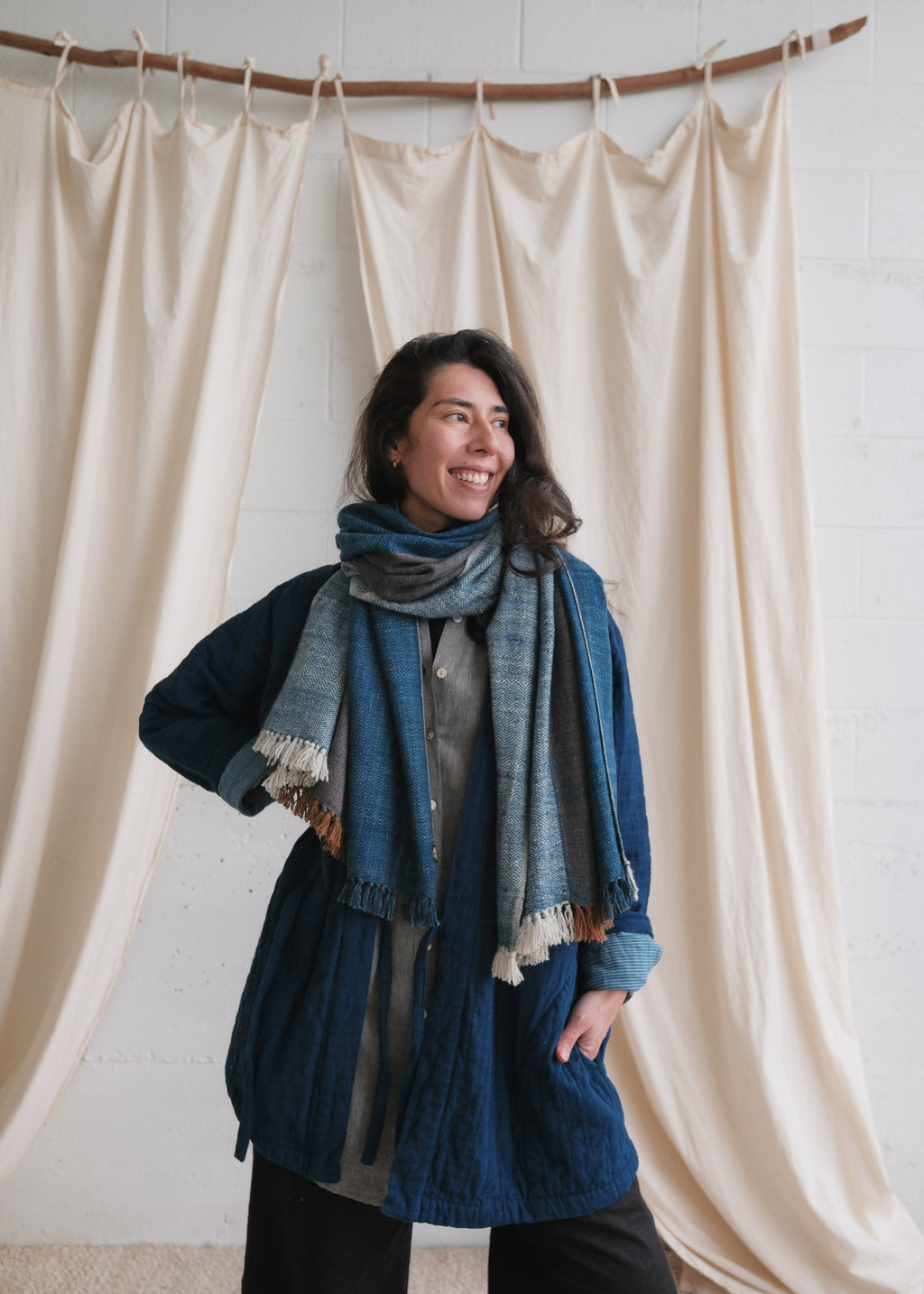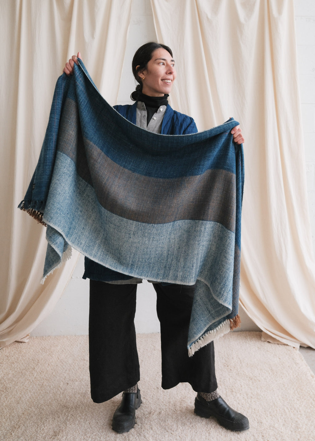 An incredibly soft shawl offering extraordinary warmth and luxury. Naturally dyed with indigo and tannins this, one of a kind piece, is an elegant heirloom that you will cherish over and over again.