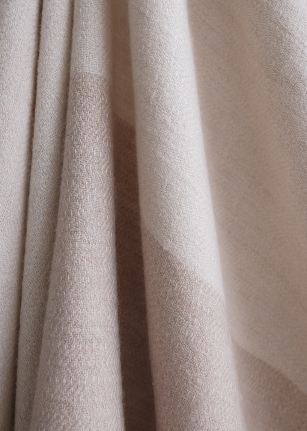 This fine fibre is handspun, handwoven and naturally dyed by the skilled artisans of Lena Ladakh, a slow textile label where each stage of production is carried by hand. Artisans use the traditional whorl and whorl-less spindles to work with these fibres. The women spin 25-35g of these fine fibres in one day. Half of these single plied spun yarns are then hand twisted into double plies for their warps. The skeins are then naturally dyed before being woven on a flying shuttle loom.