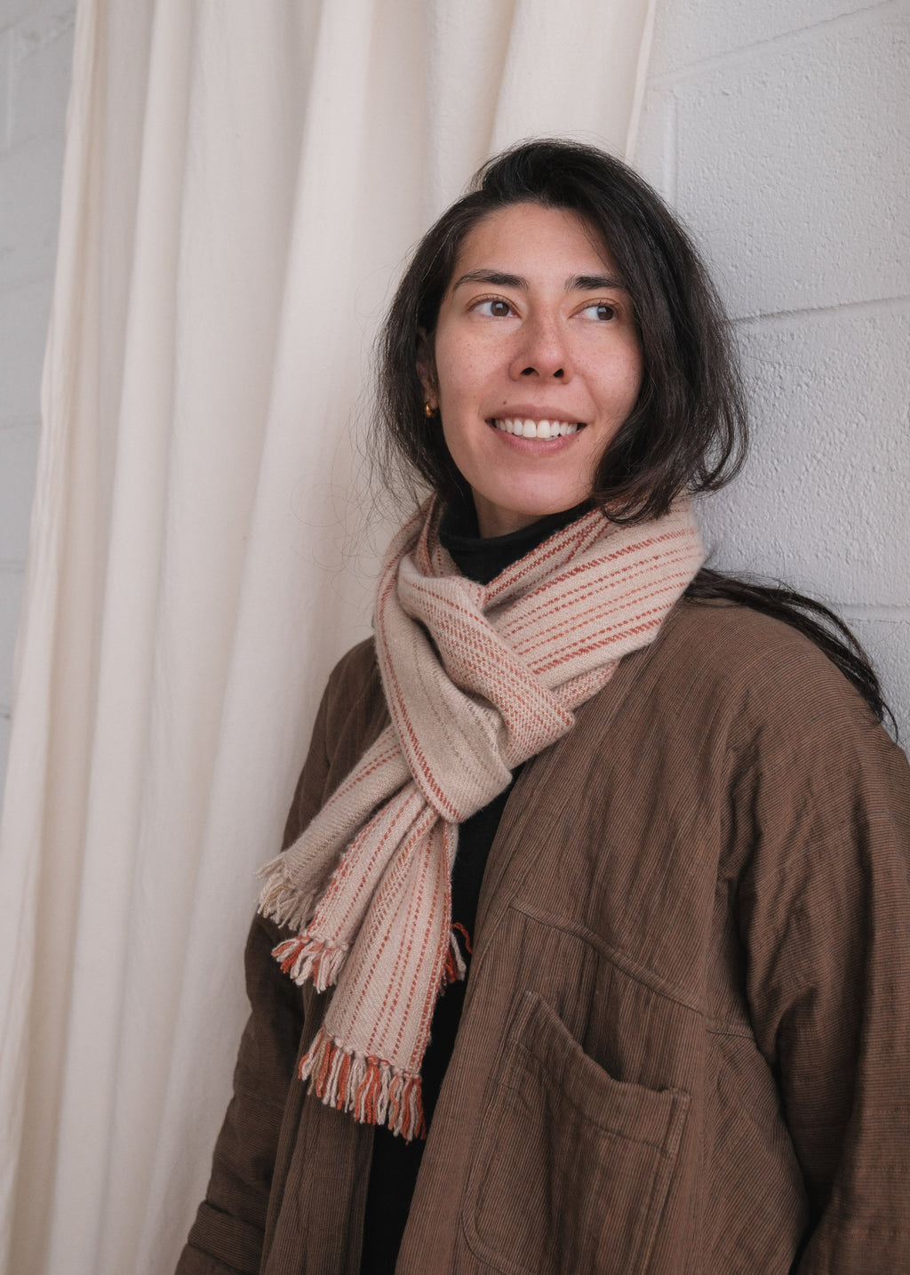 This fine fibre is handspun, handwoven and naturally dyed by the skilled artisans of Lena Ladakh, a slow textile label where each stage of production is carried by hand. Artisans use the traditional whorl and whorl-less spindles to work with these fibres. The women spin 25-35g of these fine fibres in one day. Half of these single plied spun yarns are then hand twisted into double plies for their warps. The skeins are then naturally dyed before being woven on a flying shuttle loom.