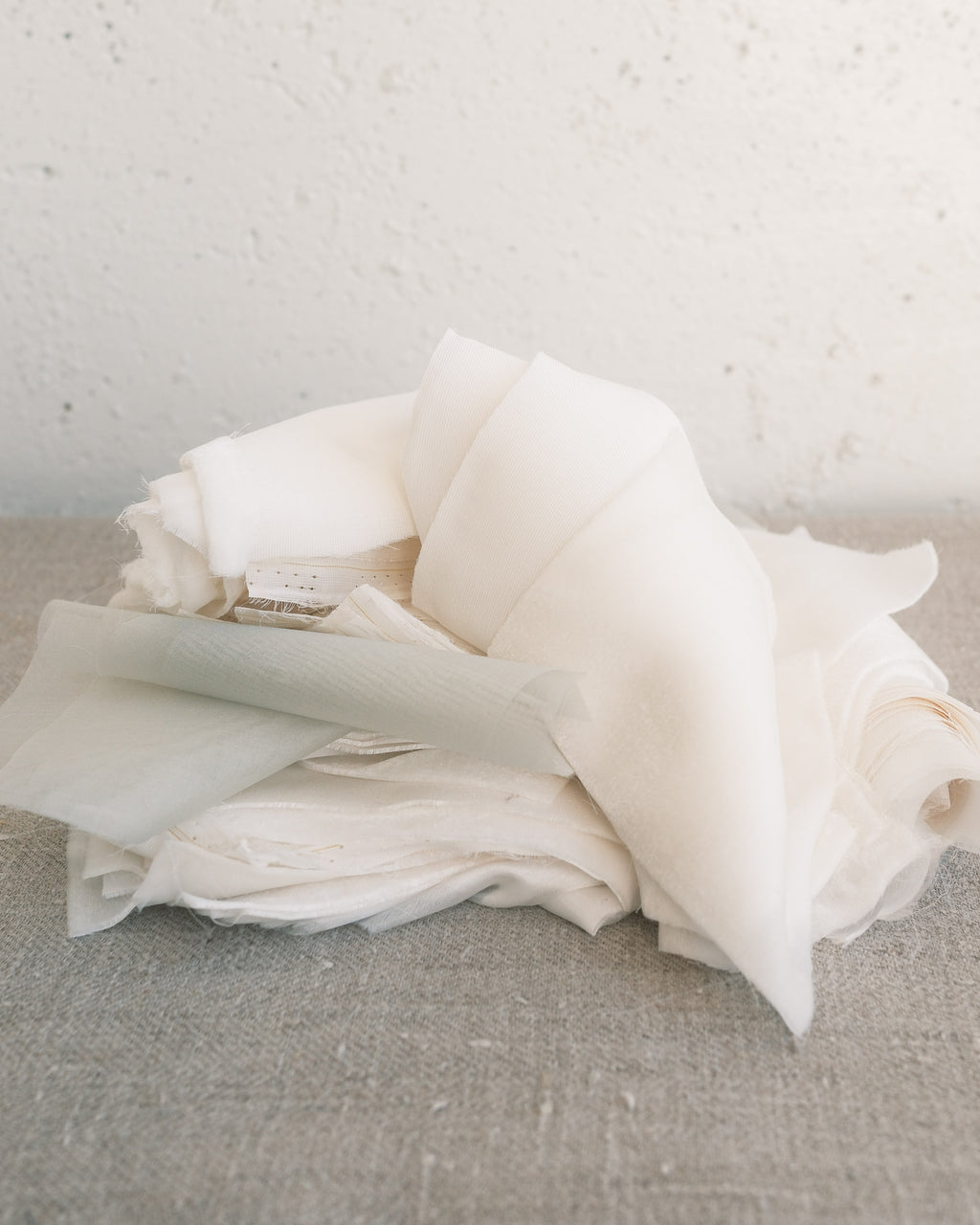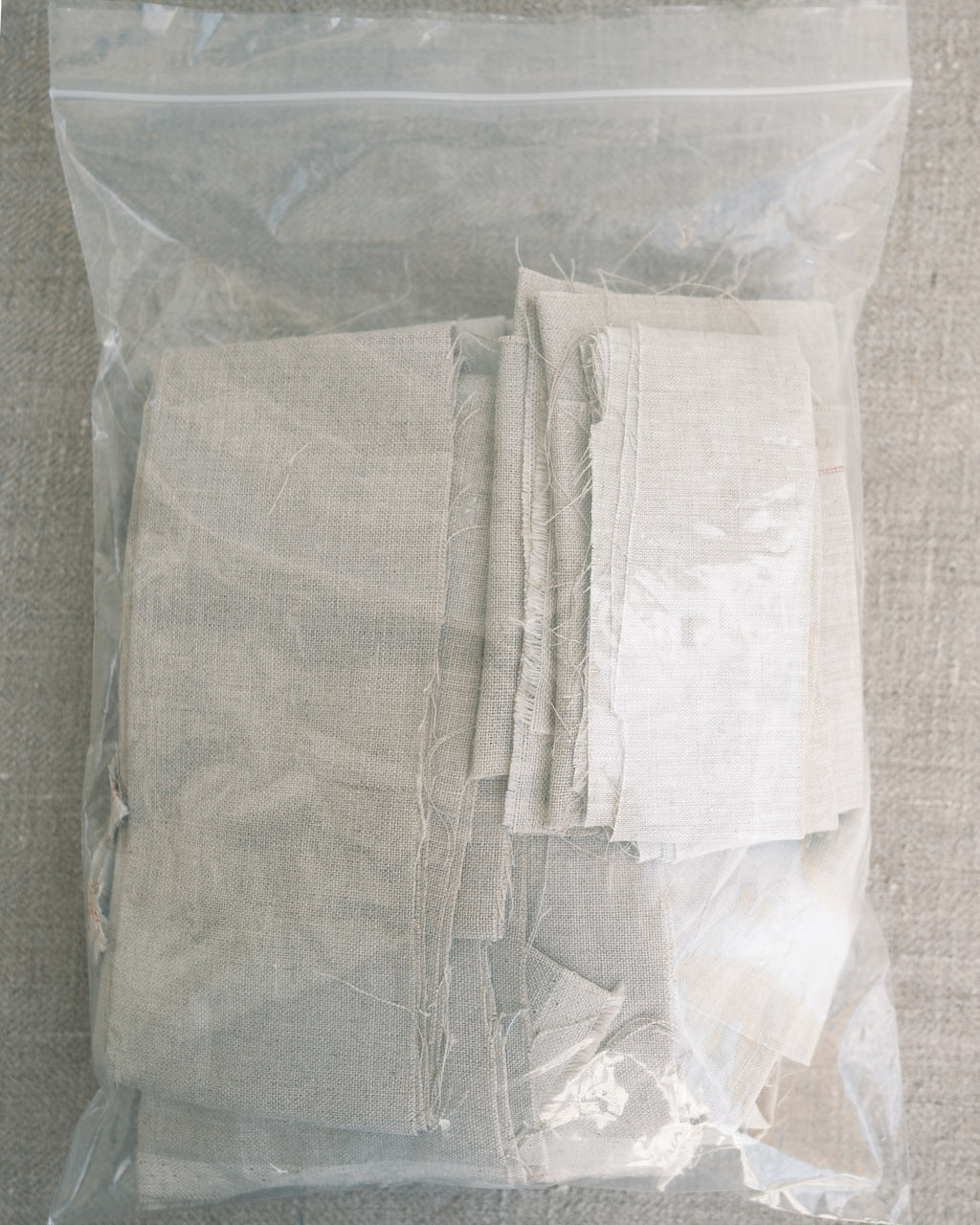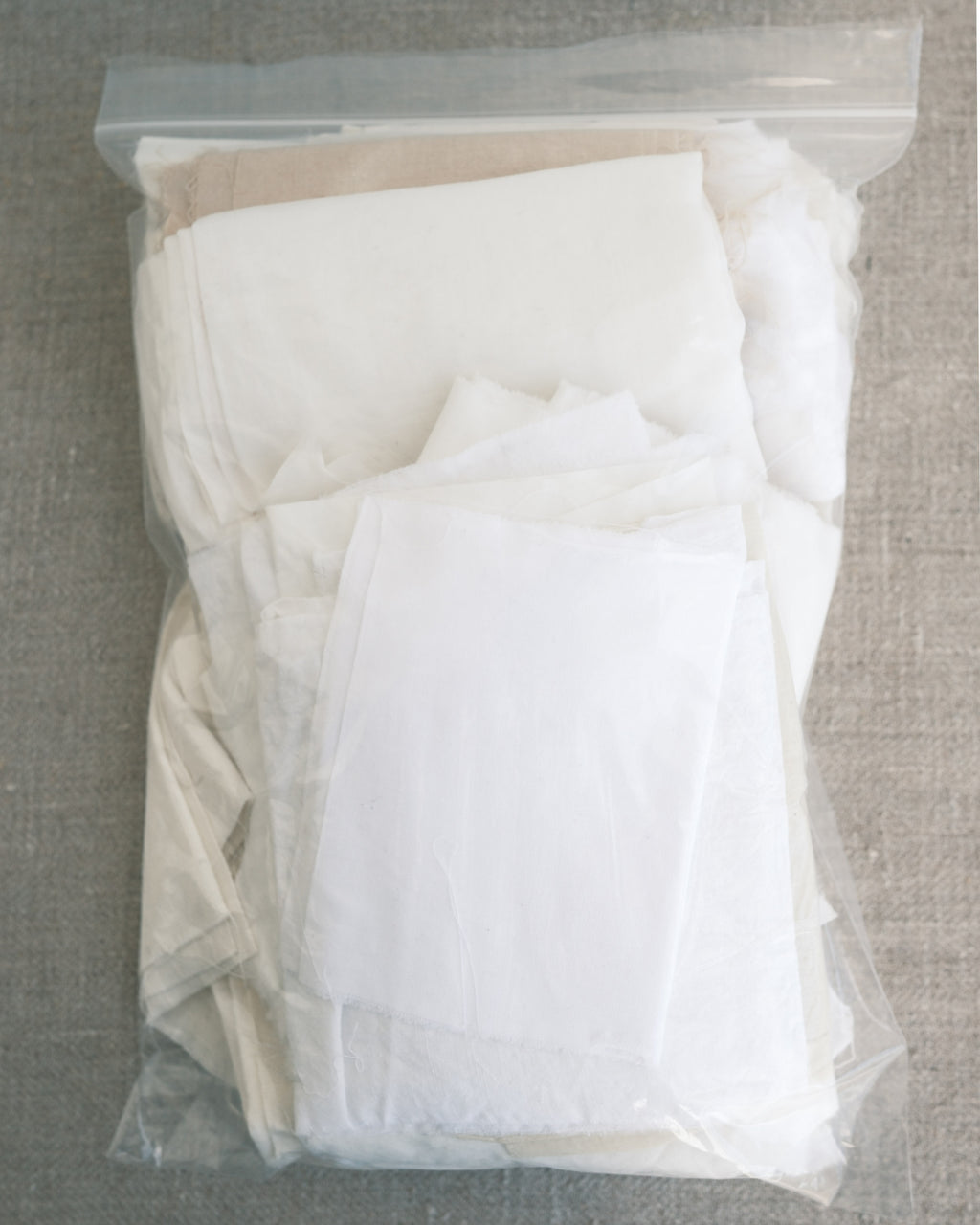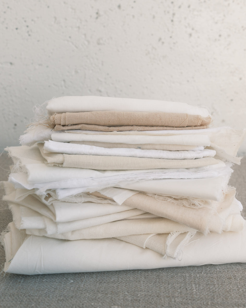 200g of mixture of natural fibres and mixture of colour offcuts. Each package includes various weights and sizes of pre-cut cloth. Great for dyeing, stitching, quilting, and other creative processes for you to dream up.