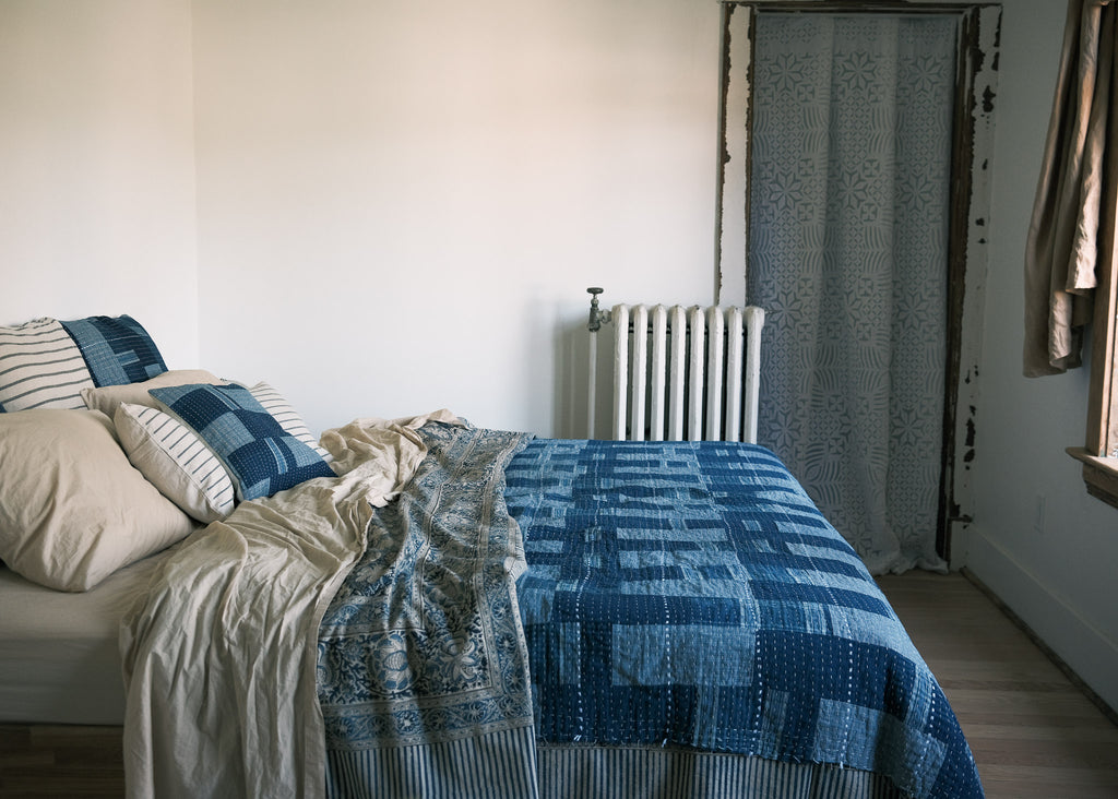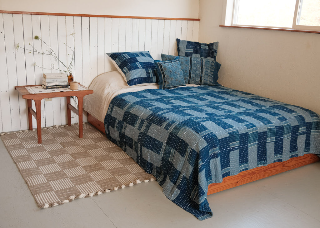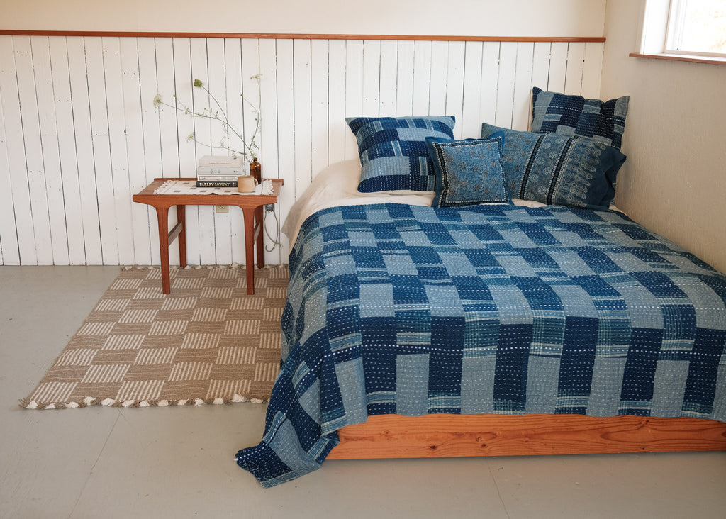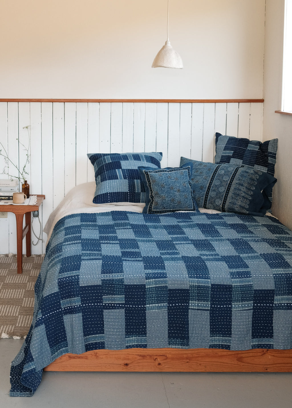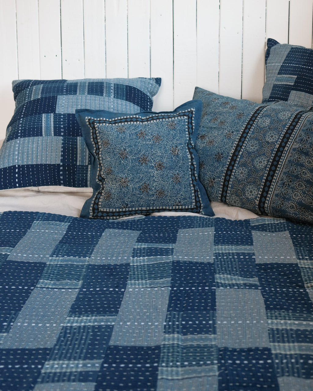 This exceptional handstitched quilt will bring warmth and wonder to your home. Made of artisan cloth - where threads first were dyed in natural fermentation indigo vats, then handwoven by skilled weavers, pieced together, and finally handstitched in Sundarbans, India. Each piece is unique and has a story to tell.
