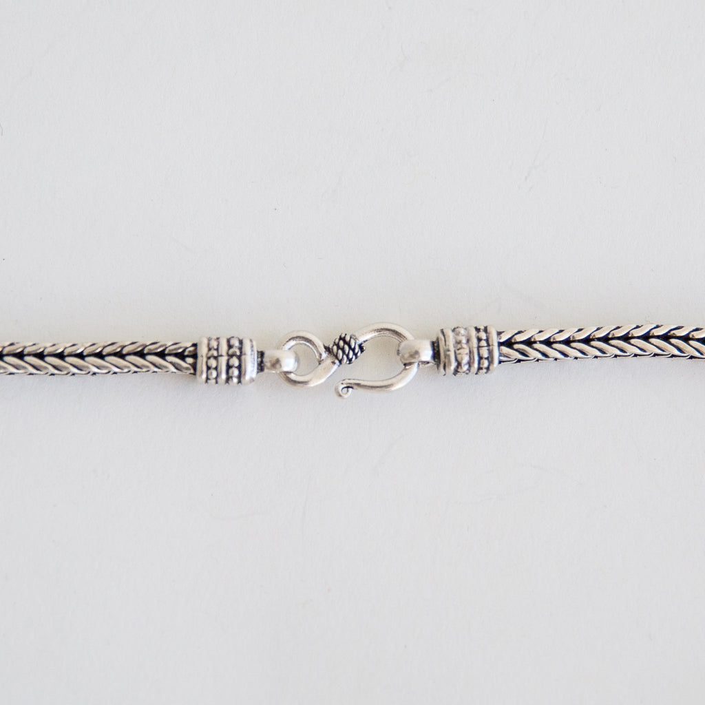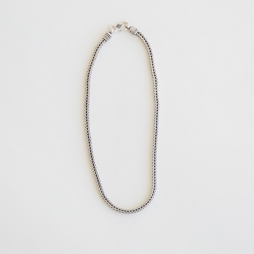 An exquisite 92.5 silver foxtail chain, square in shape. The genius of the foxtail chain design is that it makes silver drape beautifully. For a signature look, we love grouping different chains together and pairing with other pieces.