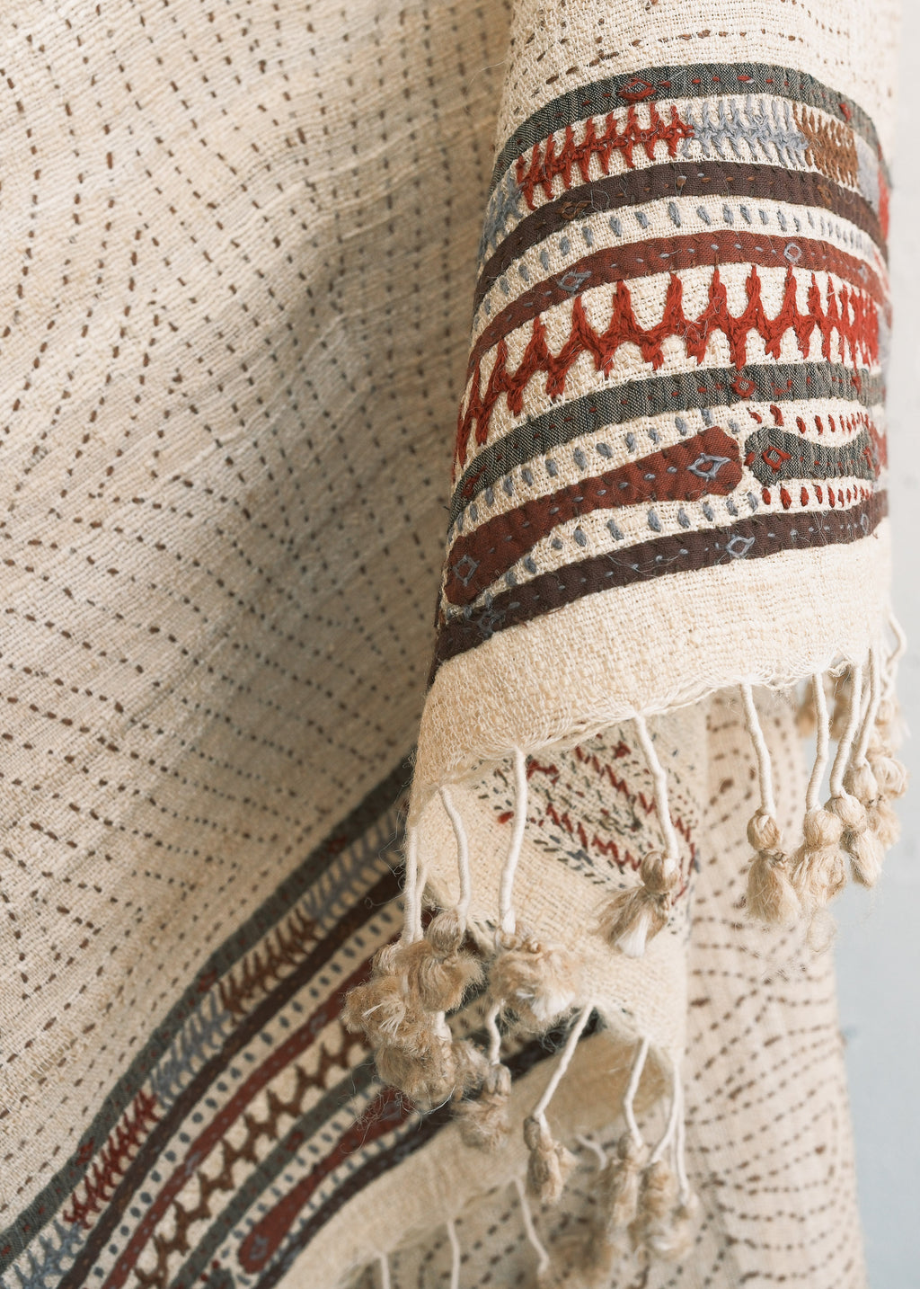 Process: Handwoven & hand embroidered by village artisans in Kachchh, India.