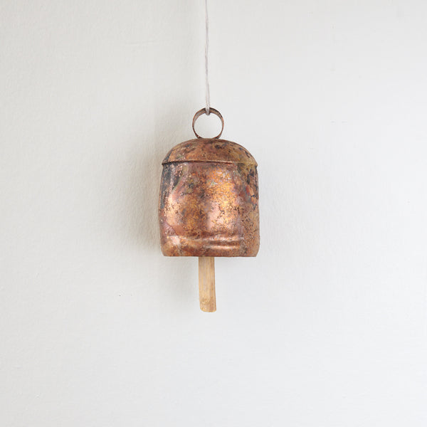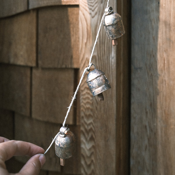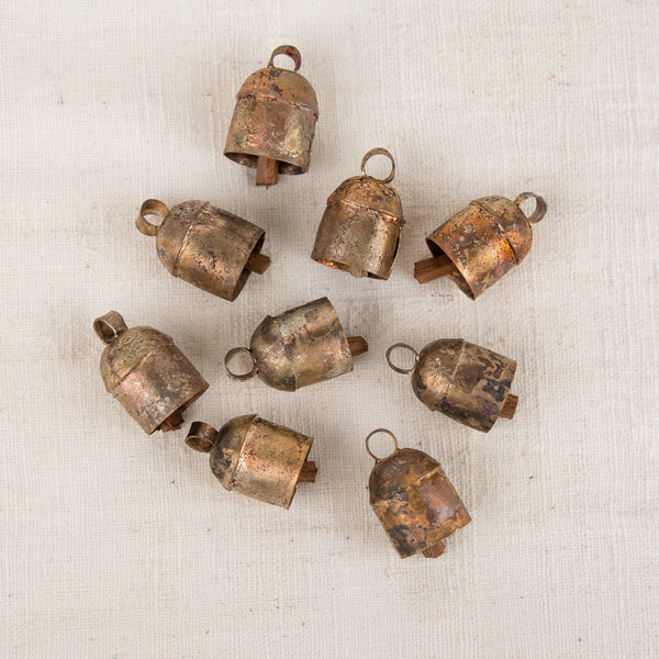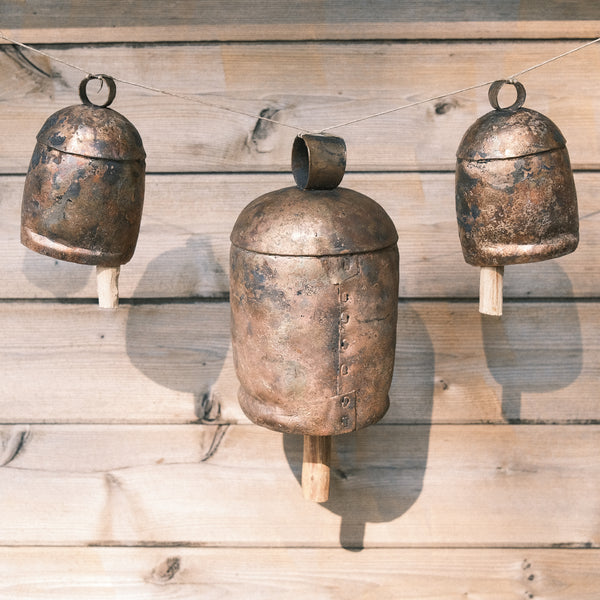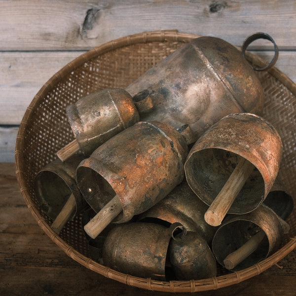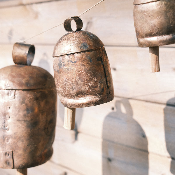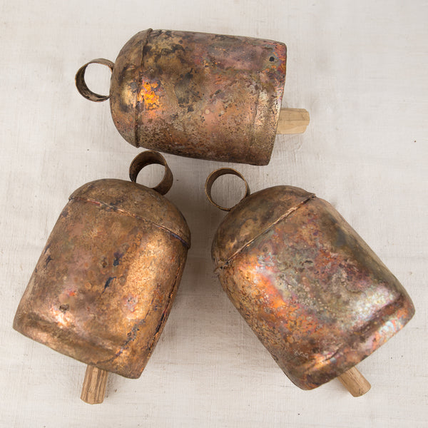 Hand forged bells from artisan bellmakers of the Kachchh desert. Forged with simple hand tools. Fired in a kiln. Individually tuned until the bell maker is satisfied that the tone is clear and true. These bells are the instruments that turn a flock of sheep into an orchestra.