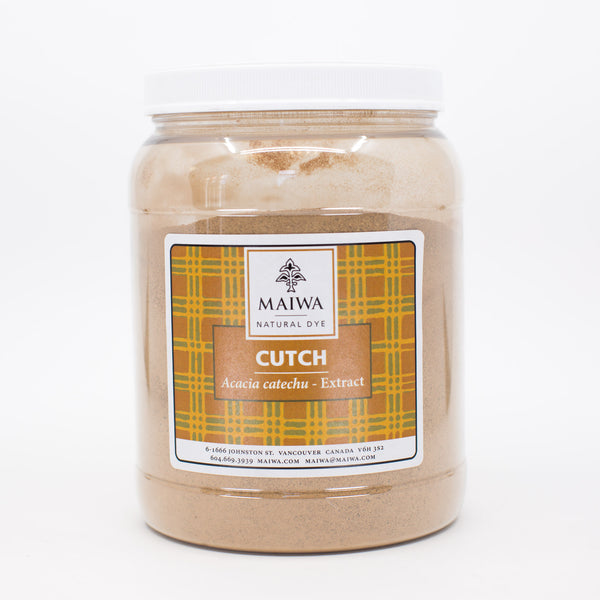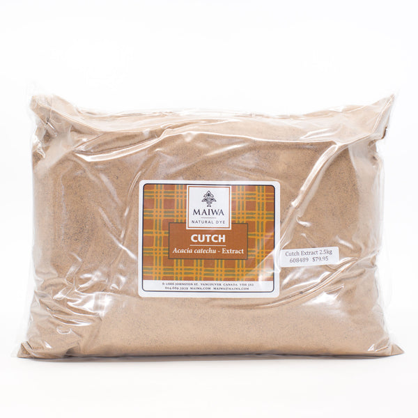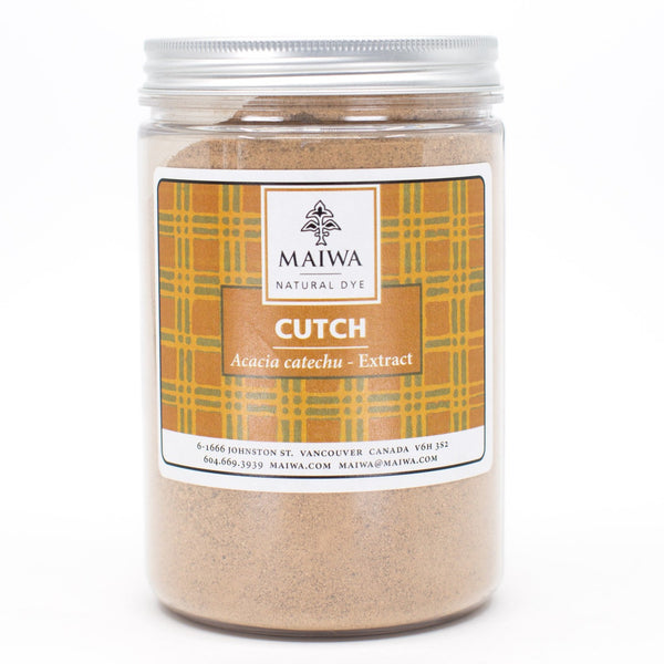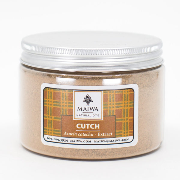 Cutch Extract – This powder is an extract prepared from steeping the wood of the Acacia catechu tree in hot water until a syrupy liquid emerges. This is dried and then ground into powder. It is common to most parts of India, Burma, Indonesia and Peru. Indian cutch is by far the most beautiful. It is a good source of colourfast shades of brown - cinnamon, nutmeg, and clove. Cutch extract contains tannin as well as the dye compound catechu. It is easily soluble in water. Cutch has excellent light and washfast properties. Our most recent batch of cutch requires 15-30% WOF to dye a medium depth of shade.
