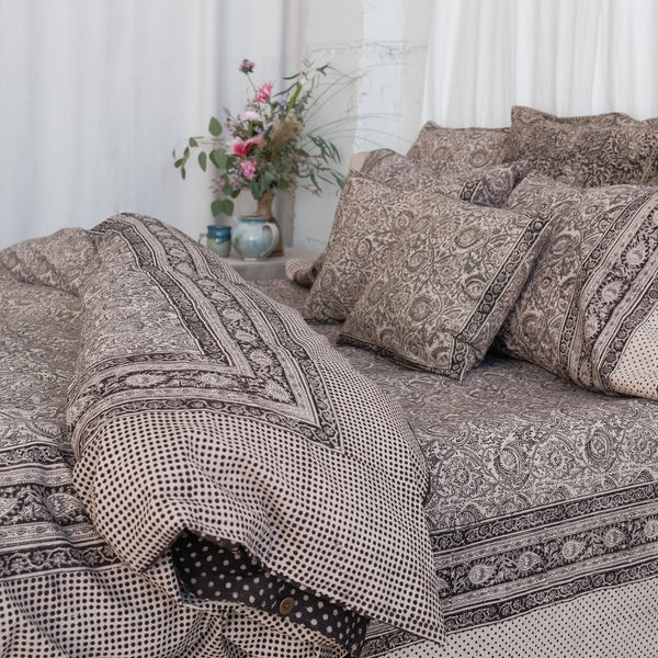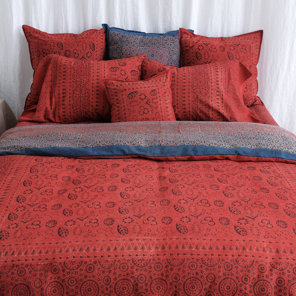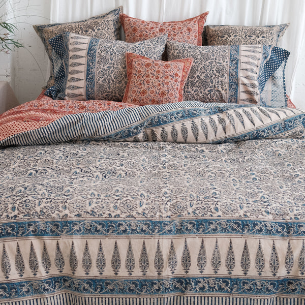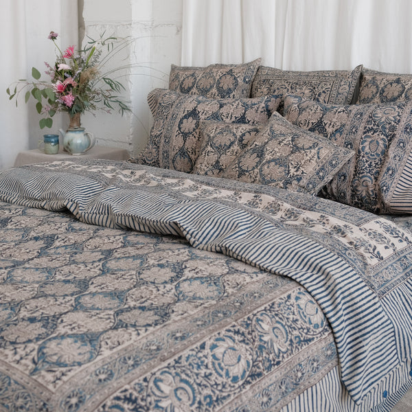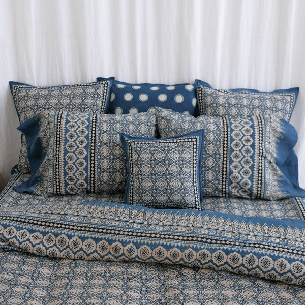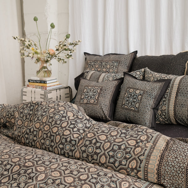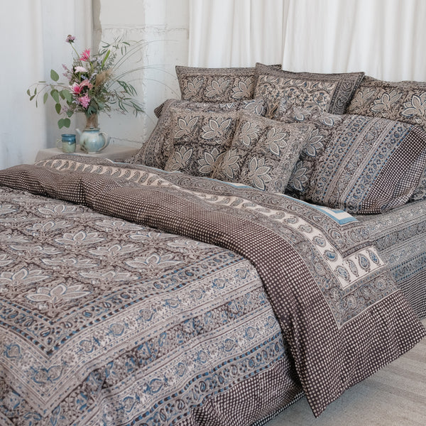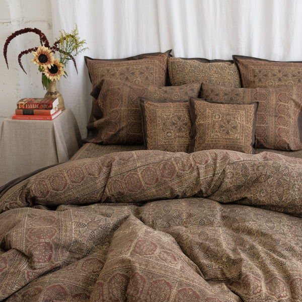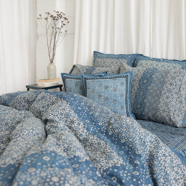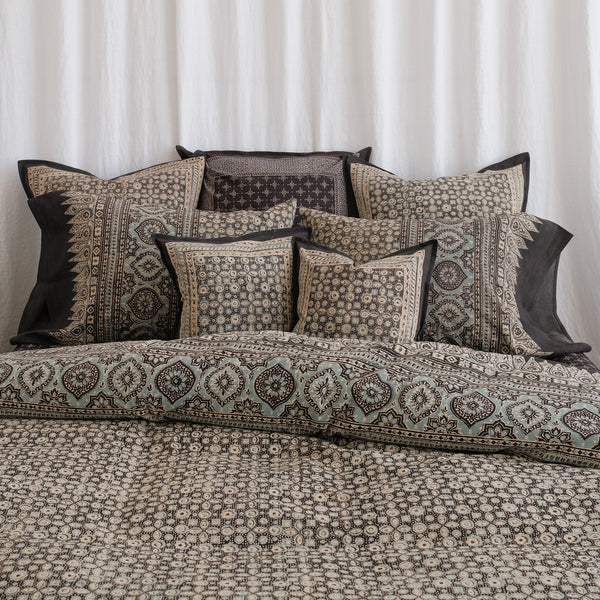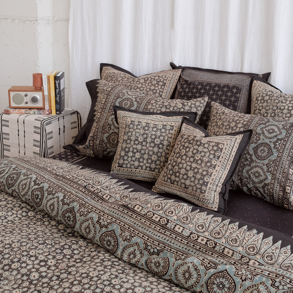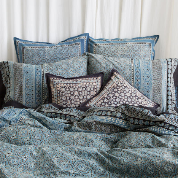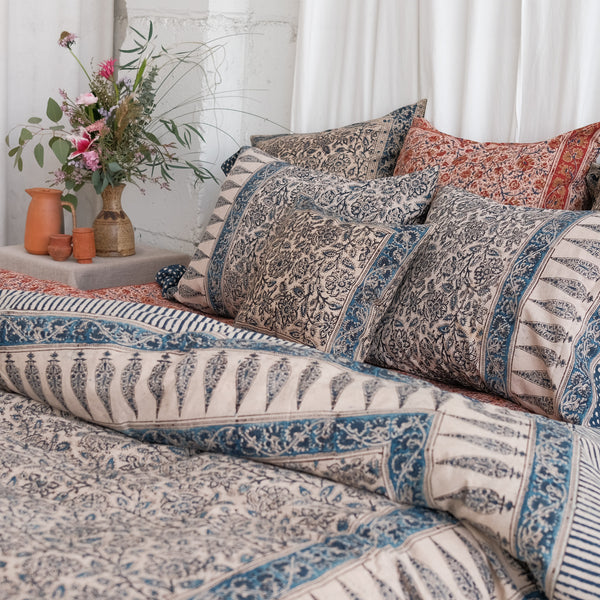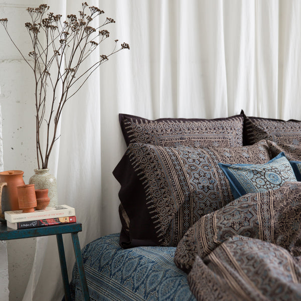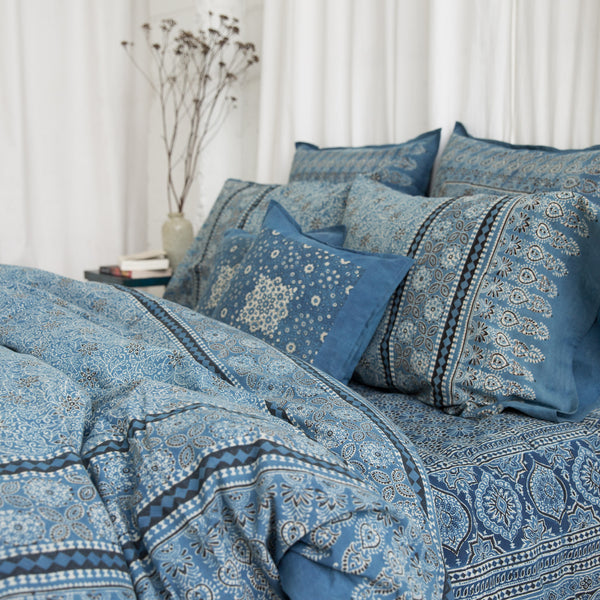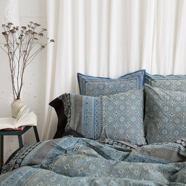 Organic cotton duvets that have been hand block printed with natural dyes. We feature four traditional block printing techniques: Ajrakh, Dabu, Kalamkari, and Bagh. For centuries, wooden blocks have been used to print eloquent geometric patterns on cotton. These patterns are timeless, revealing a remarkable play between figure and line. Crawl into cozy artisan crafted organic cotton bedding today!