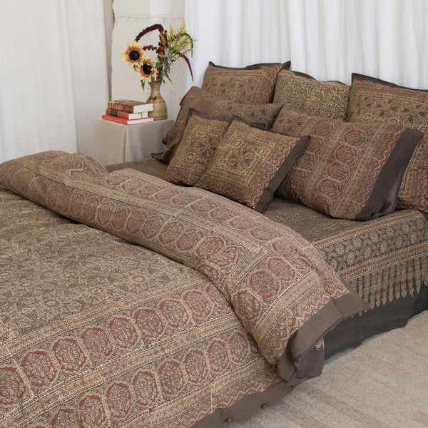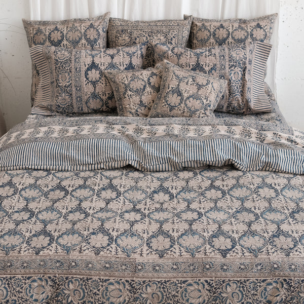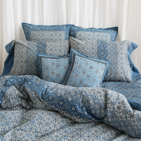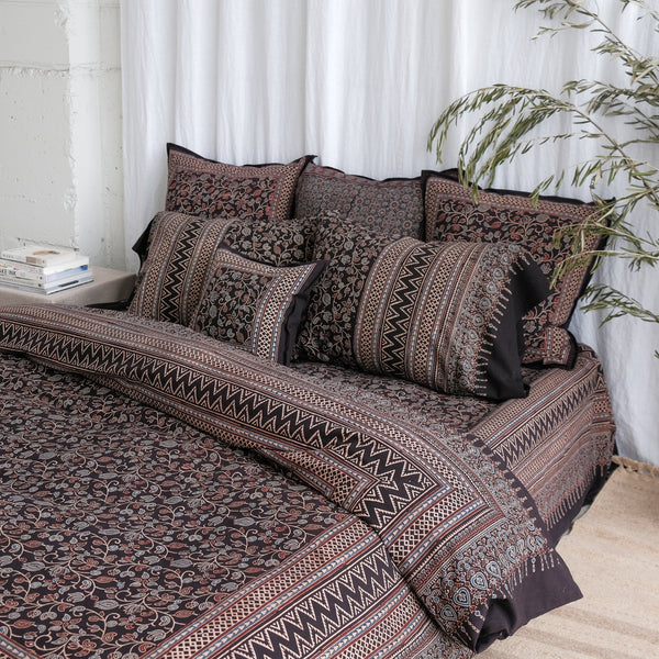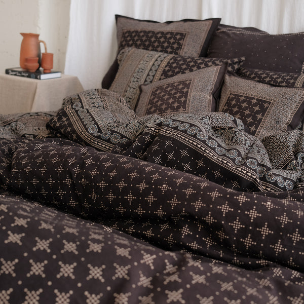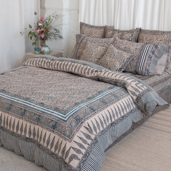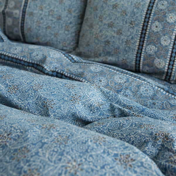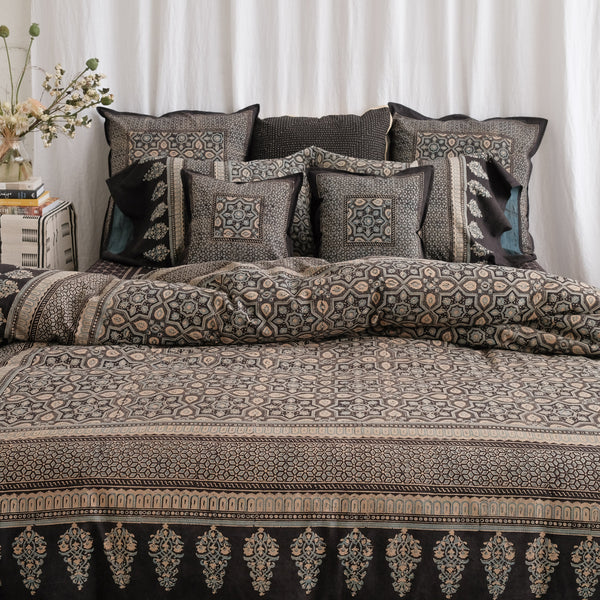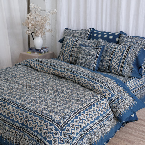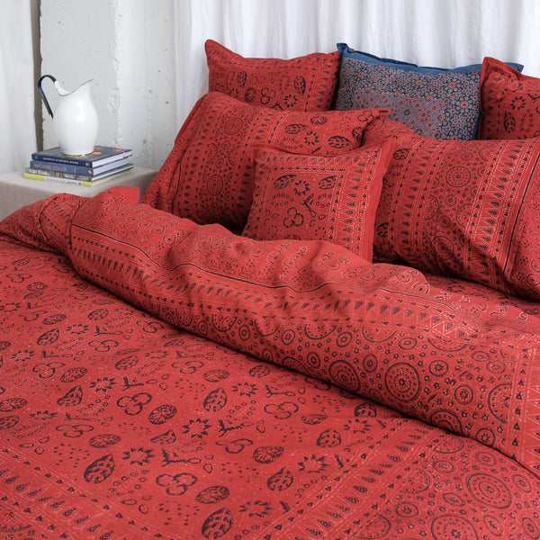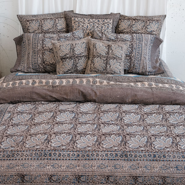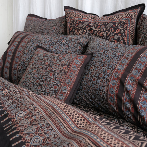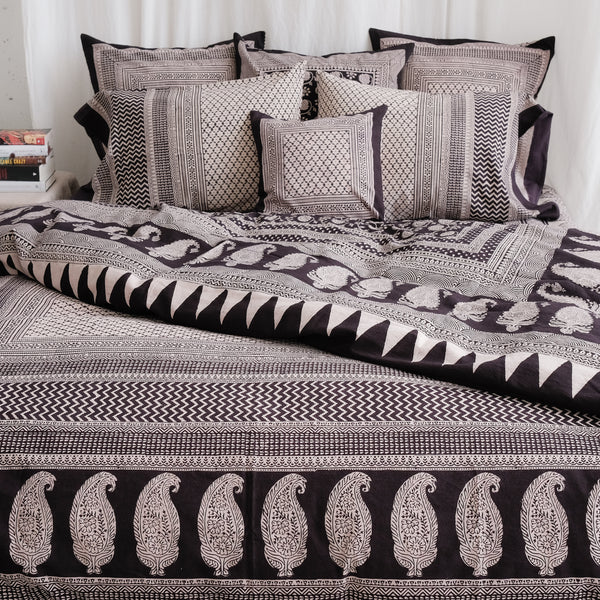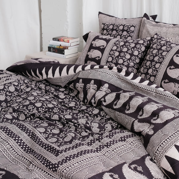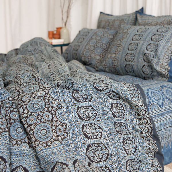 Organic cotton duvets that have been hand block printed with natural dyes. We feature four traditional block printing techniques: Ajrakh, Dabu, Kalamkari, and Bagh. For centuries, wooden blocks have been used to print eloquent geometric patterns on cotton. These patterns are timeless, revealing a remarkable play between figure and line. Crawl into cozy artisan crafted organic cotton bedding today!