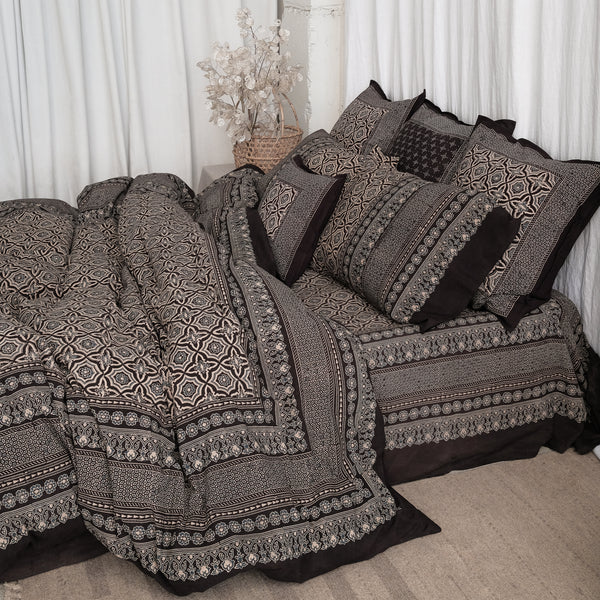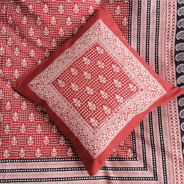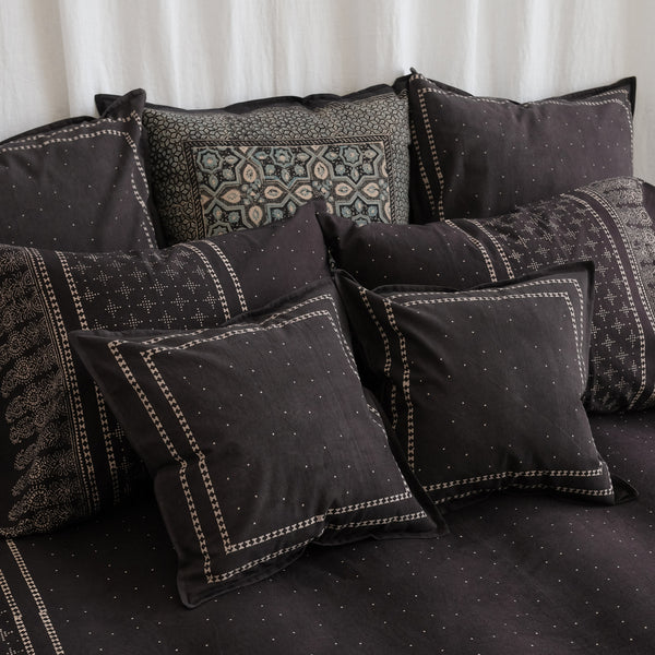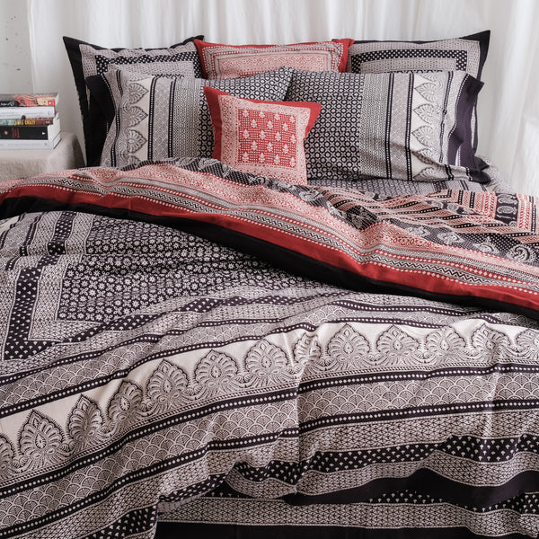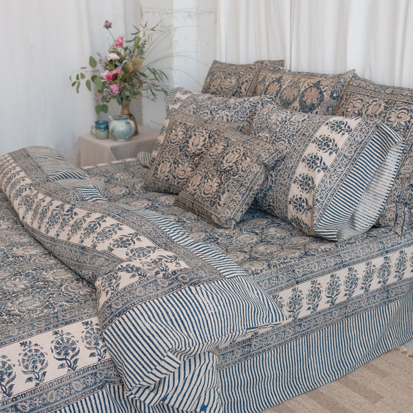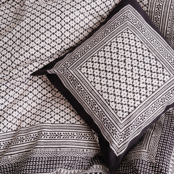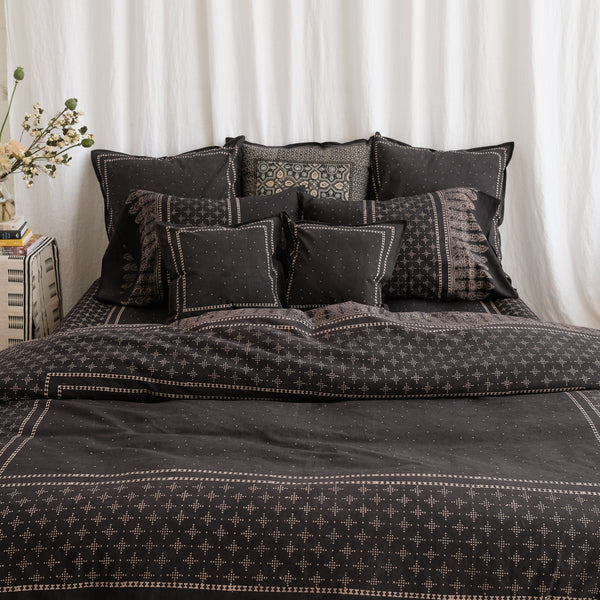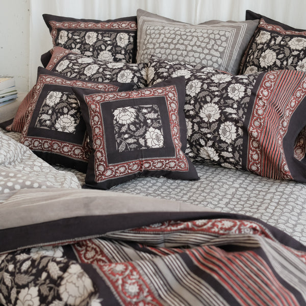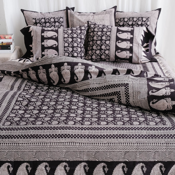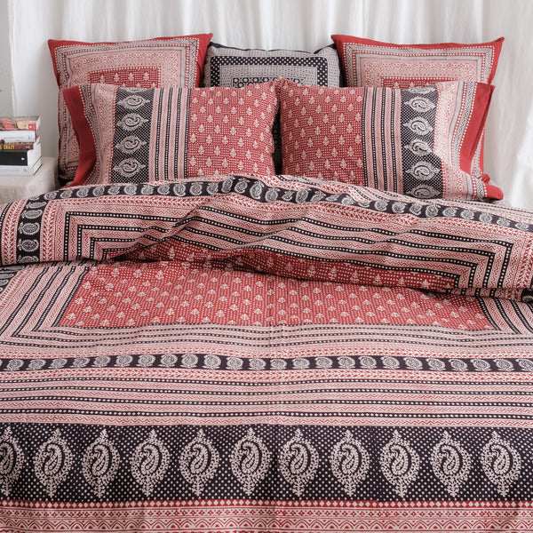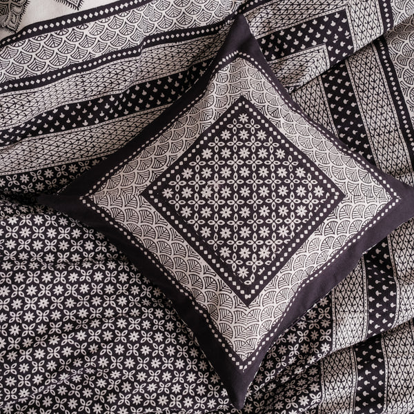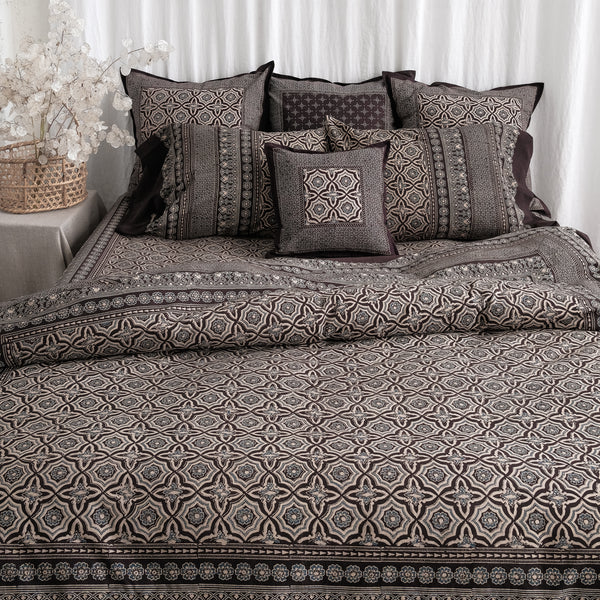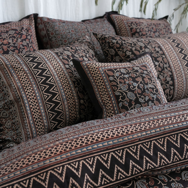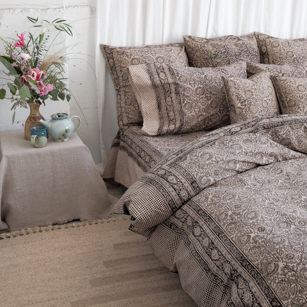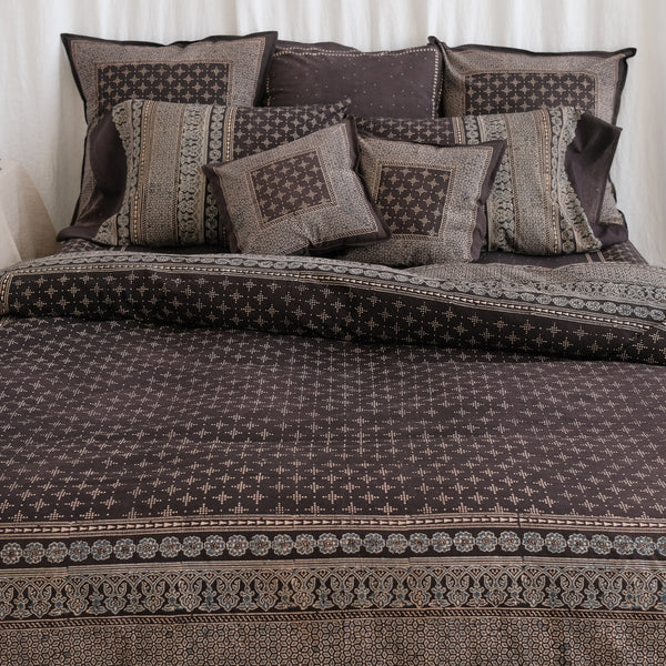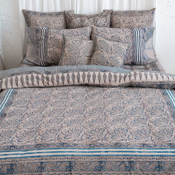 Organic cotton duvets that have been hand block printed with natural dyes. We feature four traditional block printing techniques: Ajrakh, Dabu, Kalamkari, and Bagh. For centuries, wooden blocks have been used to print eloquent geometric patterns on cotton. These patterns are timeless, revealing a remarkable play between figure and line. Crawl into cozy artisan crafted organic cotton bedding today!