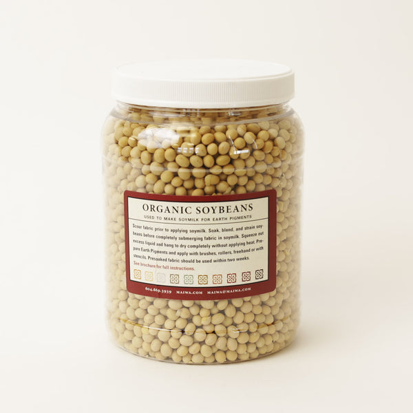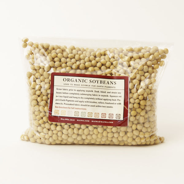 Earth pigments are not dyes: they do not dissolve in solution, nor do they form molecular bonds with fibres. To work on textiles, paper or other surfaces, the pigment is combined with a binder (or media) which bonds the pigment to the surface. Acrylic and gum arabic are popular binders. For cloth we prefer soymilk where the proteins in the milk act as the binder. Our experience with earth pigments is on natural fibres.