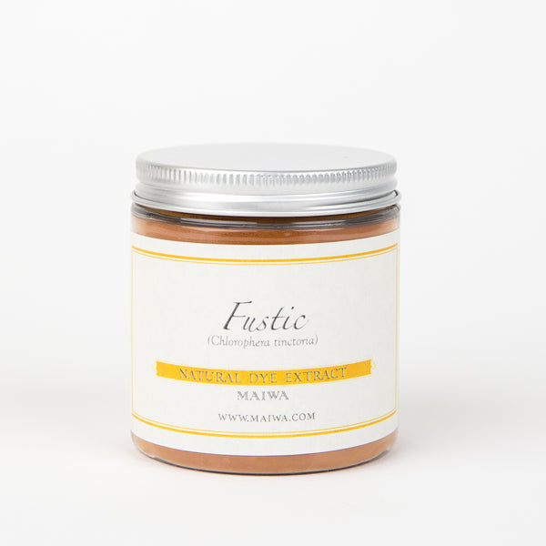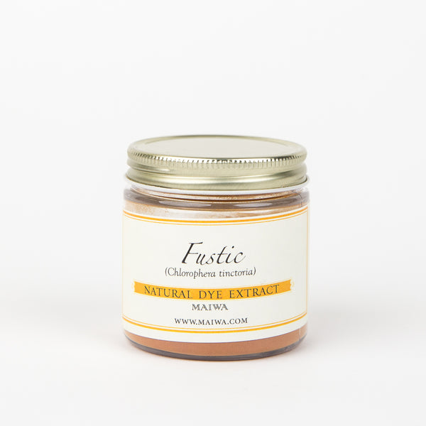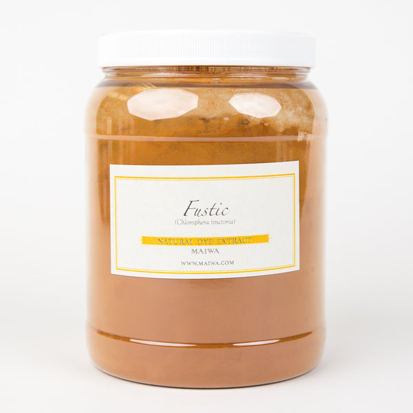 Fustic - An extract prepared from the heartwood of a tree from the Mulberry family, Chlorophora tinctoria. Fustic produces a range of colours from daffodil yellow to deep gold to orange. When used as an underdye with indigo Fustic yields forest greens and teals. Fustic has a high light and washfastness and exposure to strong sunlight may actually darken colours.
