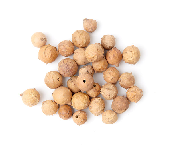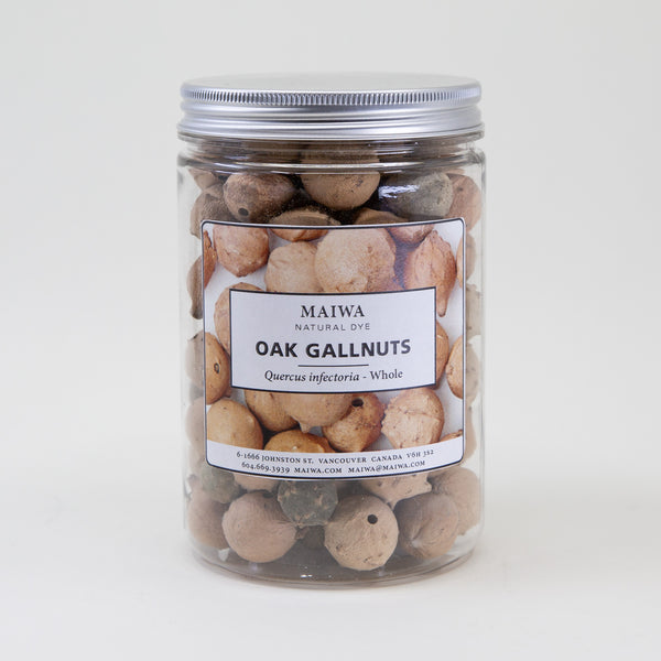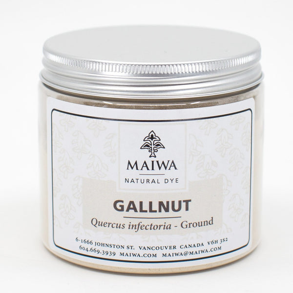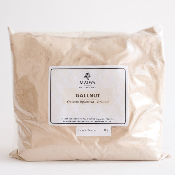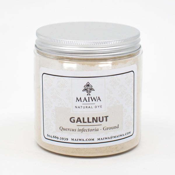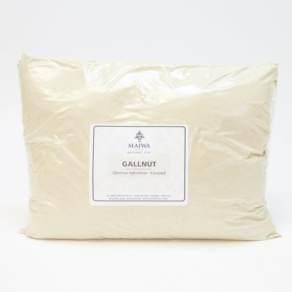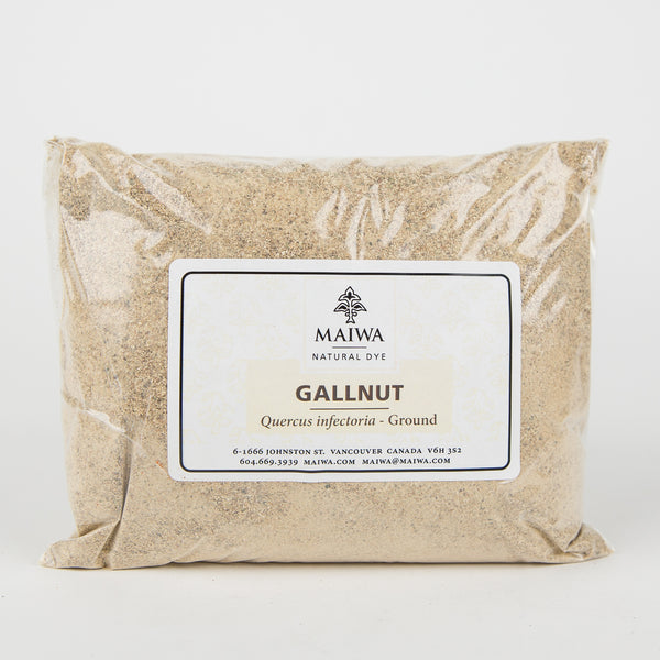 Gallnut (oak gall, quercus infectoria) - is used to mordant cellulose fibres and fabrics before an alum mordant is used. Alum does not combine as readily with cellulose fibers as it does with protein fibers. Fortunately tannins have a great affinity for cellulose fibre and once mordanted with tannin, alum combines well with the tannin-fiber complex. Gallnuts (nutgalls) from the oak tree are one the earliest and richest source for natural tannin. They are produced by insects that deposit their eggs in small punctures they make on young branches. The tree excretes a tannin-rich substance that hardens and forms into a gallnut. These are collected and ground for use as a tannin mordant. Gallnuts are used in the leather tanning industry, and for in some medicines. Use at 10-12% WOF. Use 6-8% WOF for Gallnut Extract.
