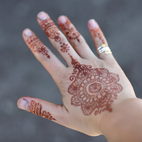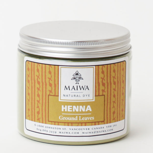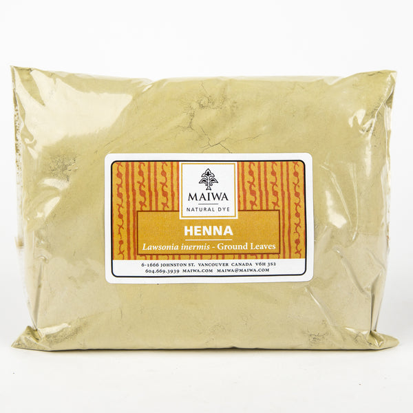 Henna – the leaves are harvested from the shrub Lawsonia inermis. Henna produces a brown colour tending toward a red-orange on protien fibres. The dye comes from leaves that are dried and ground into a powder. Henna bonds well with protein, hence is used to dye skin (mendhi), hair, fingernails, leather, silk and wool. On cellulose fibres henna yields light yellow greens.