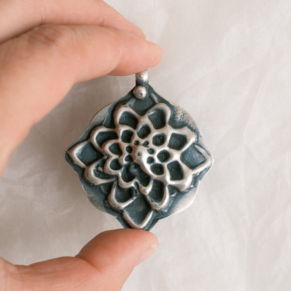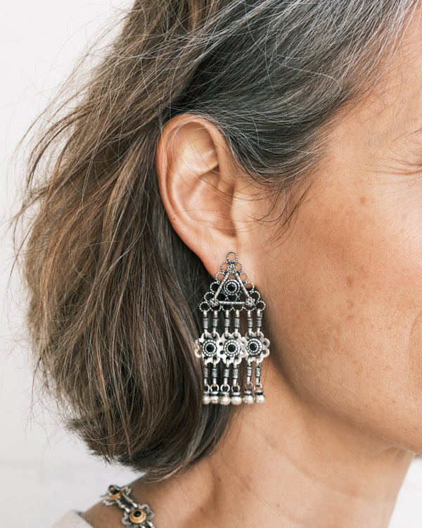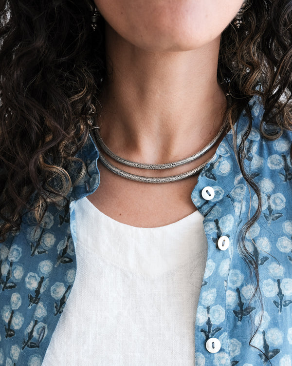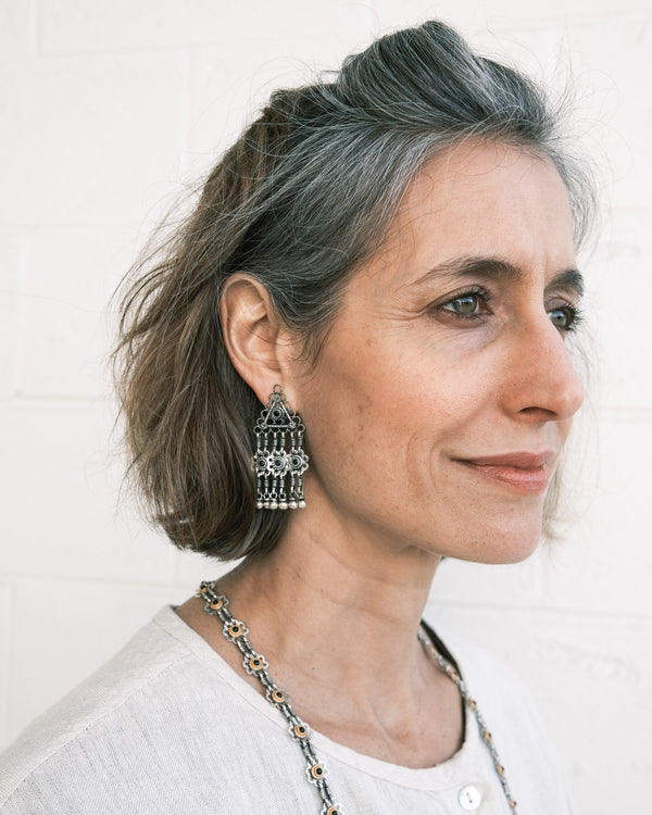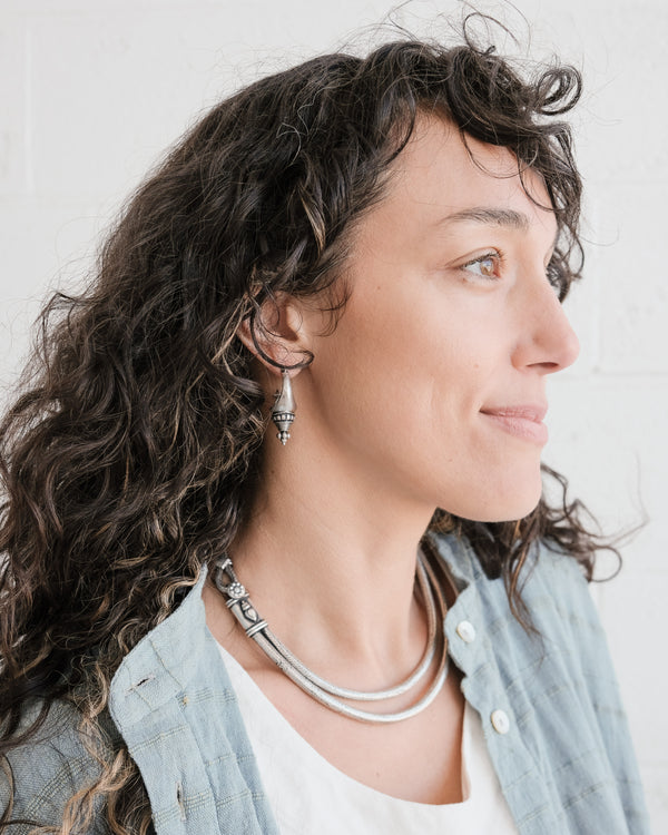 We seek out silver tribal jewelry, such as amulets, necklaces, earrings, traditional miniature painted pendants, and more. When working in India we employ local silversmiths to set stones and traditional pieces in 92.5% silver settings.