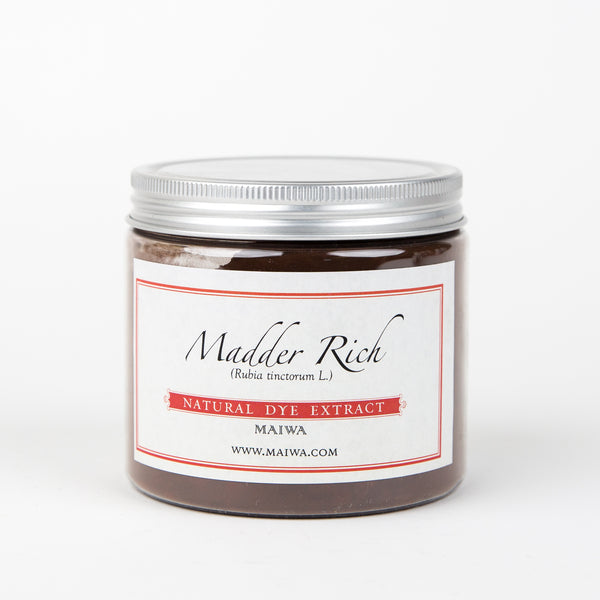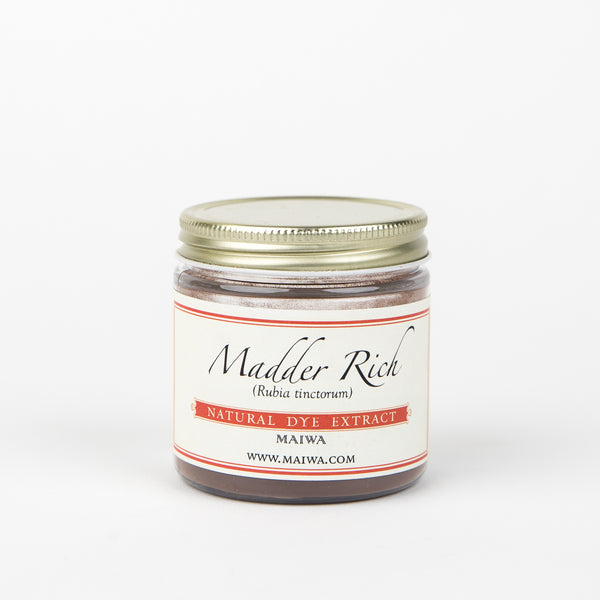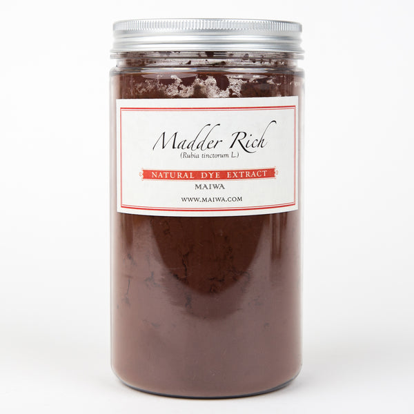 Madder is one of the oldest known dyestuffs. It is used to produce turkey reds, mulberry, orange-red, and terracotta. In combination with other dyes madder can give crimson, purple, rust, browns, and near blacks. Madder is cultivated throughout India, south east Asia, Turkey, Europe, south China, parts of Africa, Australia and Japan. Madder is a complex dyestuff containing many colourants.