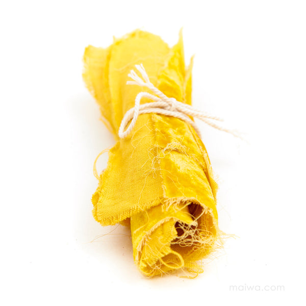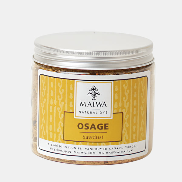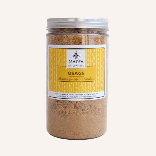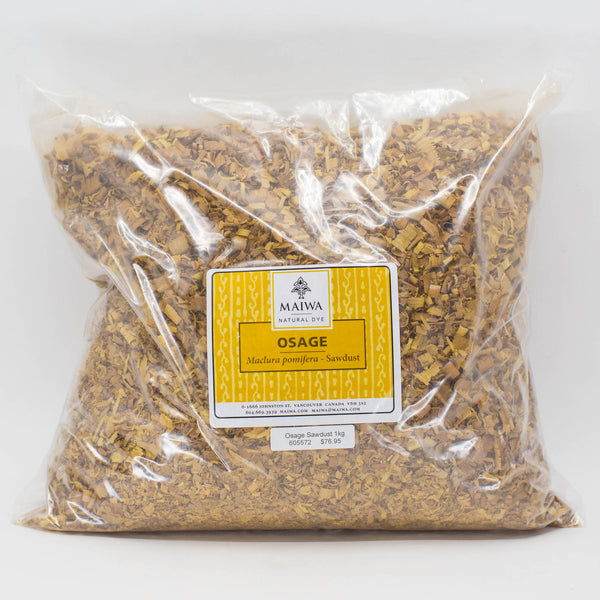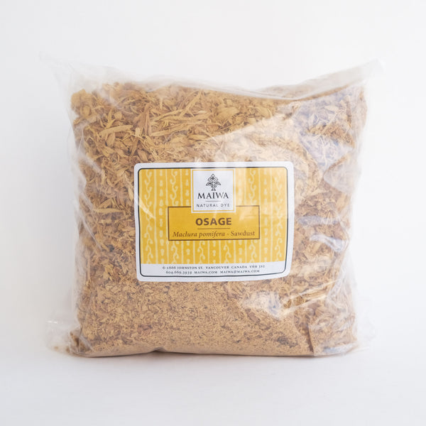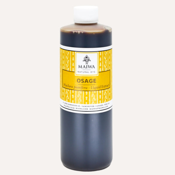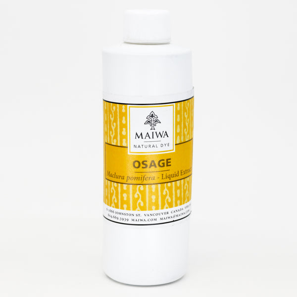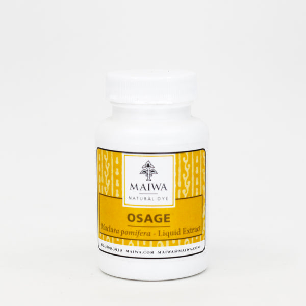 Osage - consists of the shredded wood of the tree Maclura pomifera. Osage contains a yellow dye similar to fustic and black oak and yields clear, true yellows to soft yellow greens that have a high light and washfastness. It yields good depth of shade at 20-30% WOF. Osage grows throughout the south and central United States. The tree was originally planted to help with wind erosion, the wood was used to build fences and was hard enough for wagon wheels. Osage has overgrown many areas and is being cut down for firewood. Our supplier rescues these logs and chips them for us or soaks them in water and through a solar process extracts the liquid concentrate.