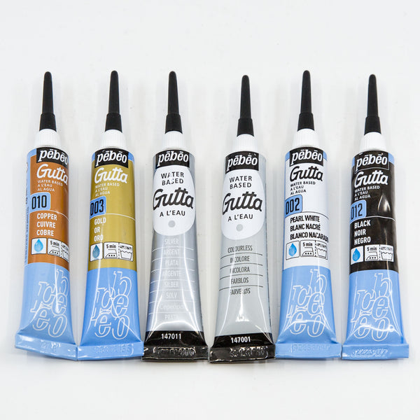 Water based gutta in a multi-colour set, ideal for creating designs when painting on silk. The thick consistency creates a resist barrier so the paints do not bleed into each other. Wash-resistant after having been heat set with an iron.