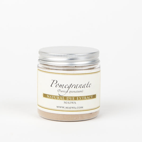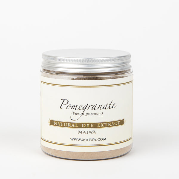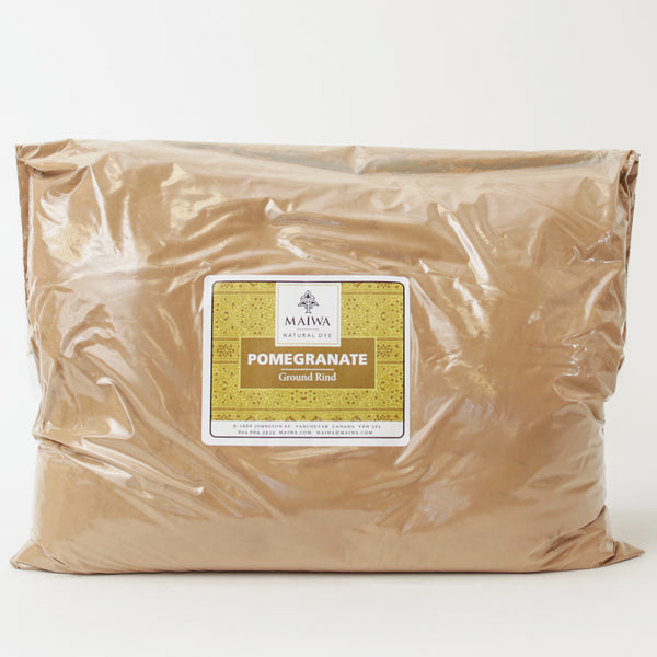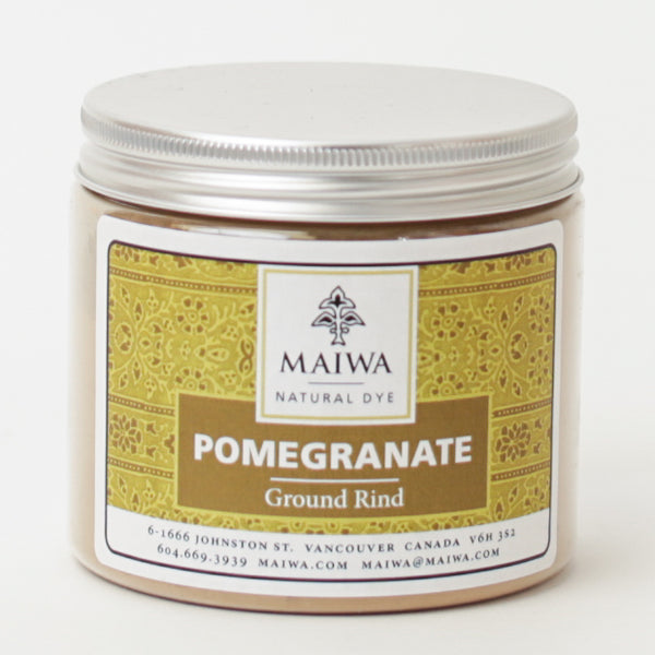 Pomegranate - An extract from the rinds of pomegranates (Punica granatum), this dyestuff is high in tannin and improves the light and washfastnes of any dye with which it is mixed. In India and Southeast Asia it is used as both a dye and a mordant. Pomegranate yields soft yellows to green-yellows and requires 15-20% wof for the powder (5-8% wof for the extract) for a medium depth of shade. When combined with iron, pomegranate yields yummy warm cement greys and deep moss greens. It is often mixed with the more fugitive tumeric dye to brighten the yellow and make a lightfast tumeric.