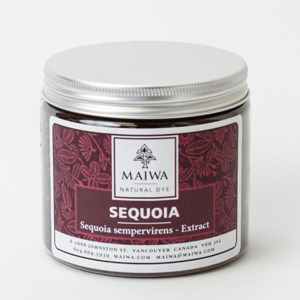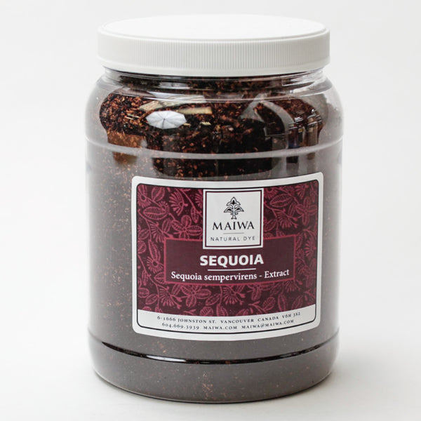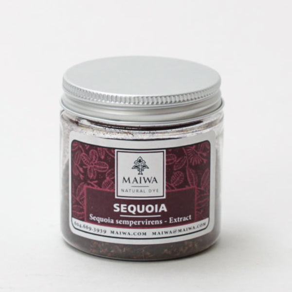 Sequoia comes from Californian Coastal Redwoods. The dyestuff occurs in minute quantities in the seed cones, and only reaches useable quantities as a byproduct of seed collection and reforestation programs. Sequoia yields rich purple browns when dyed at 15% WOF. Shades achieved are beautiful but with moderate lightfastness.