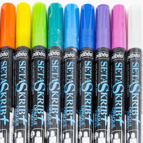The Setaskrib opaque markers have a round tip and will produce a 4mm line. They are loaded with pigment and suitable for use on light and dark textiles.