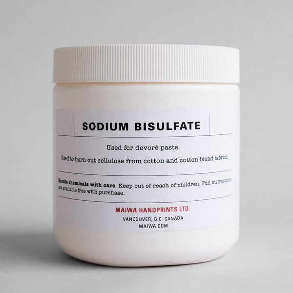 Sodium Bisulfate is a colourless/white crystalline compound that creates a very strong acid when dissolved in water. Used to burn out cellulose from cotton and cotton blend fabrics in the devore process. It is corrosive to skin and eyes in solution - wear eye protection and rubber gloves and use in a well ventilated area.