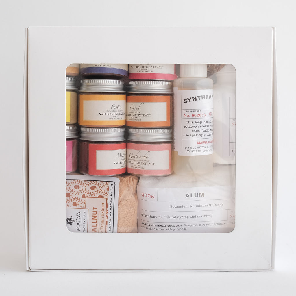 This kit comes with everything you need to get started dyeing with natural dye extracts and explore many different colours on cloth. Natural dye extracts easily dissolve in water and are so concentrated that only a small amount is needed. Great for use on all natural fibres.